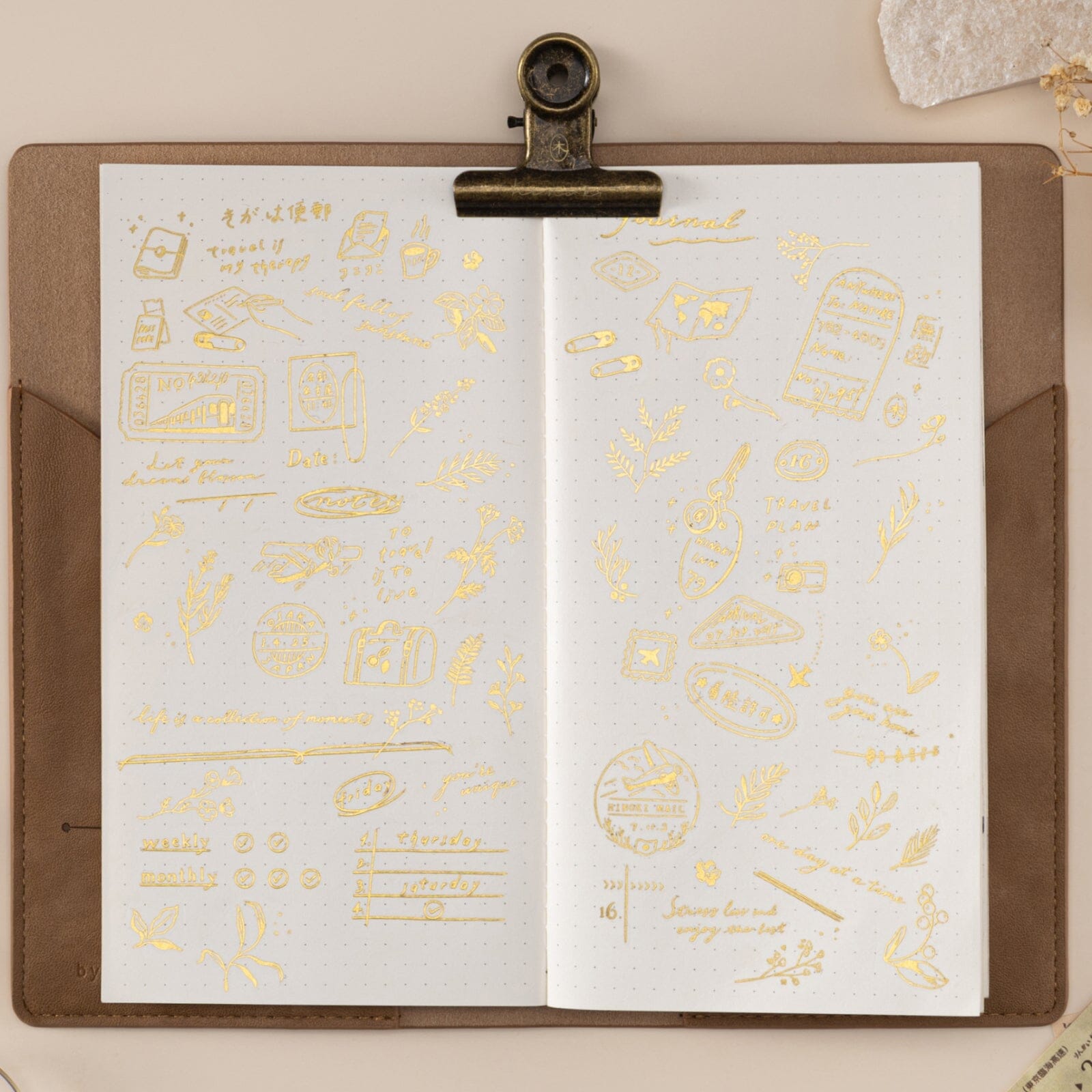 Introducing our special Hinoki ‘Daily Essentials’ Transfer Sticker Set, perfect for adding a touch of gold and sparkle to your travel notebook pages. With versatile designs to suit your every day journaling needs.