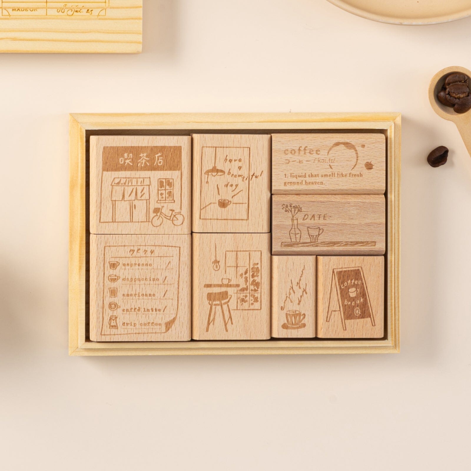 Hinoki - ‘Into the Cafe' Engraved Wooden Stamps Set