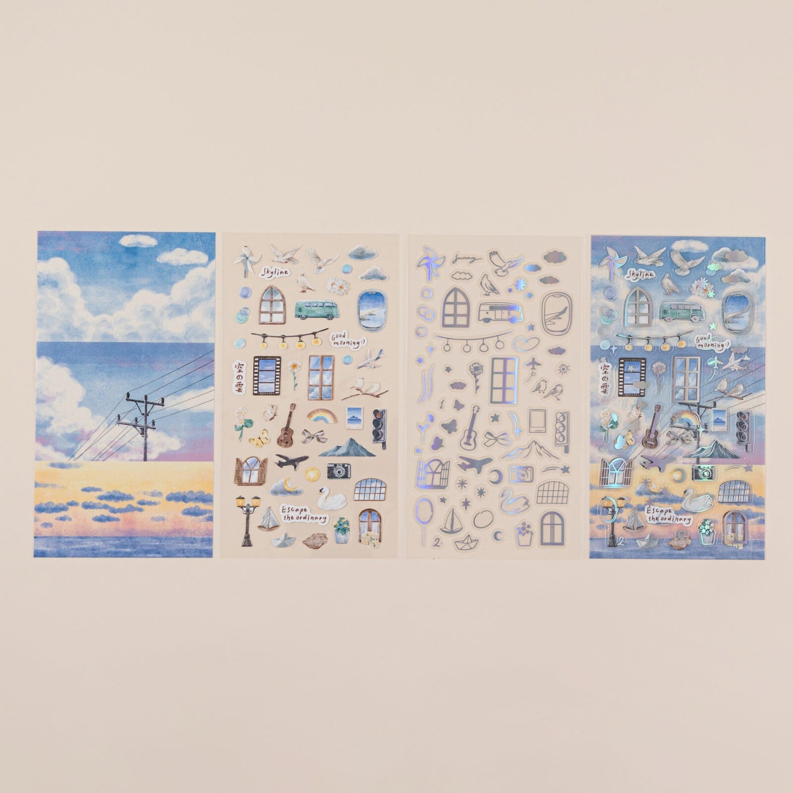 This PET sticker set includes 1x daytime sky sticker sheet, 1x daytime elements paper sticker sheet, 1x daytime foil sticker sheet, 1x night time sky sticker sheet, 1x night-time elements paper sticker sheet, 1x night-time foil sticker sheet. Peel off your favourite and immerse yourself in the comforting sky.