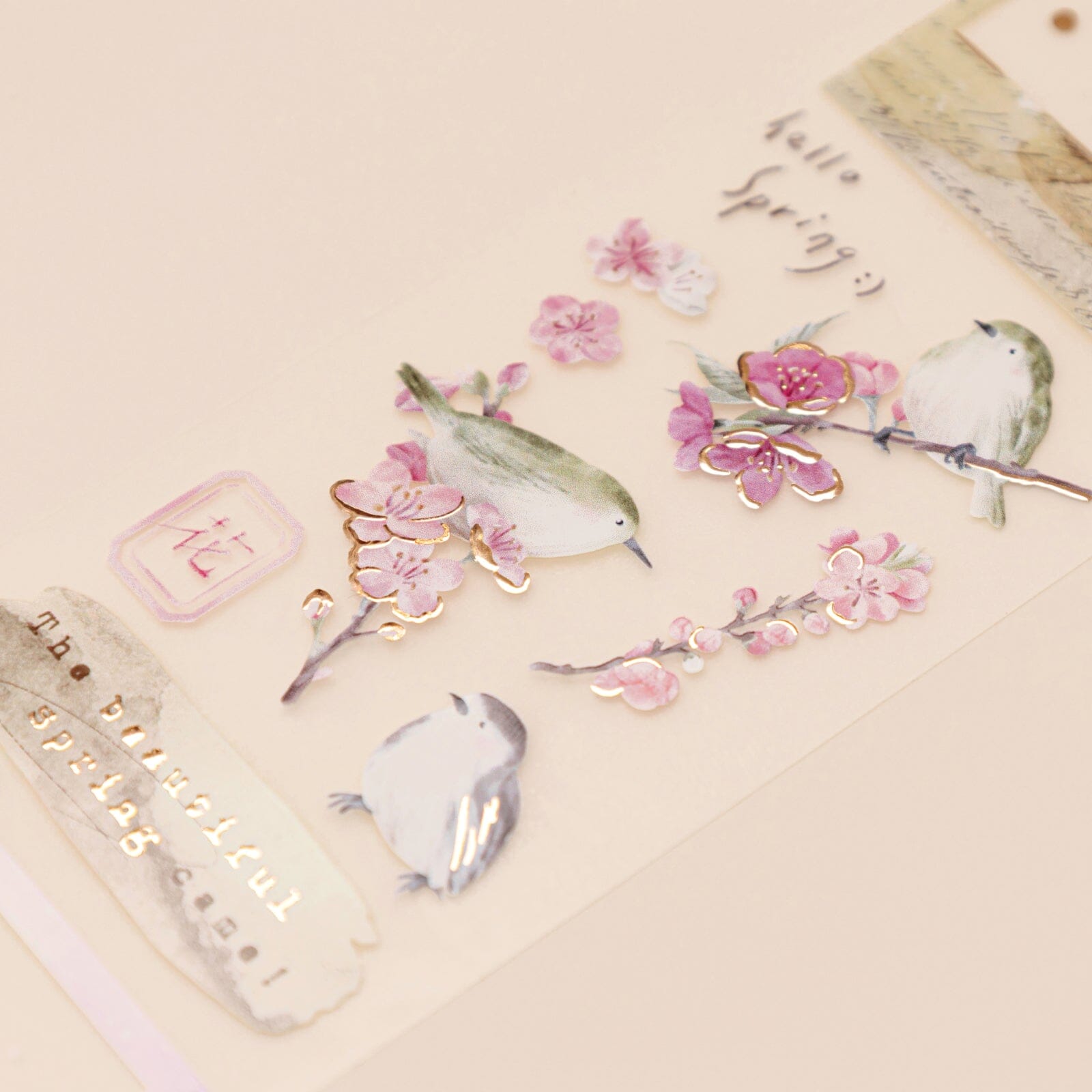 The decorative PET tape set features 2x wide Hinoki tapes with special glossy details to add a luxurious touch to your pages. The engraved wooden stamp set offers 7 luxury beech wood stamps with elegant spring song birds + floral designs. The perfect accessories for your spring journaling!