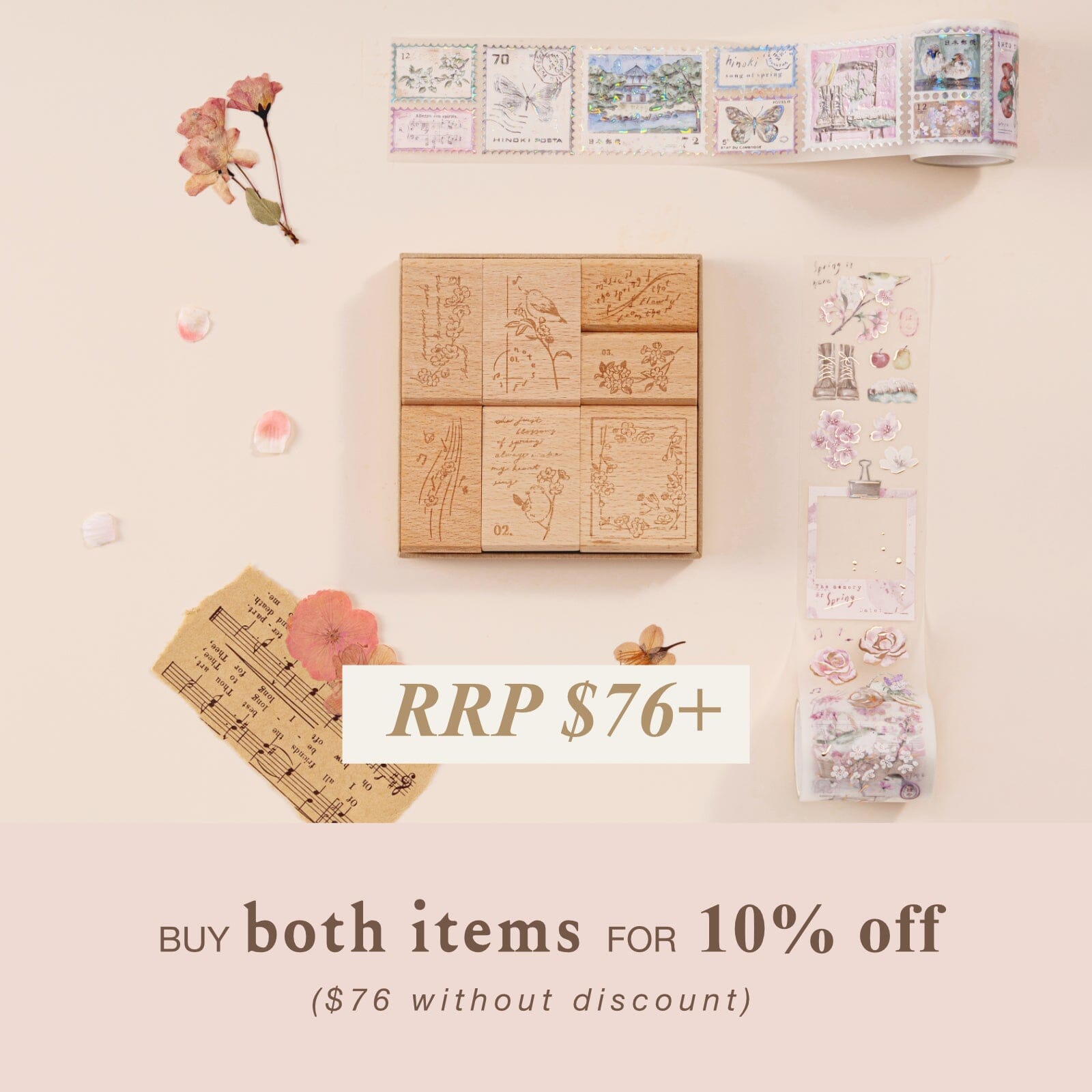 Decorate your journals with this accessories bundle including our brand new Hinoki Into the Song Decorative PET tape set + Wooden Stamps! Indulge in the peaceful and melodic spring breeze with this limited edition bundle, now available at 10% off for a limited time. Discover the essential components for creating your own delightful journaling experience.