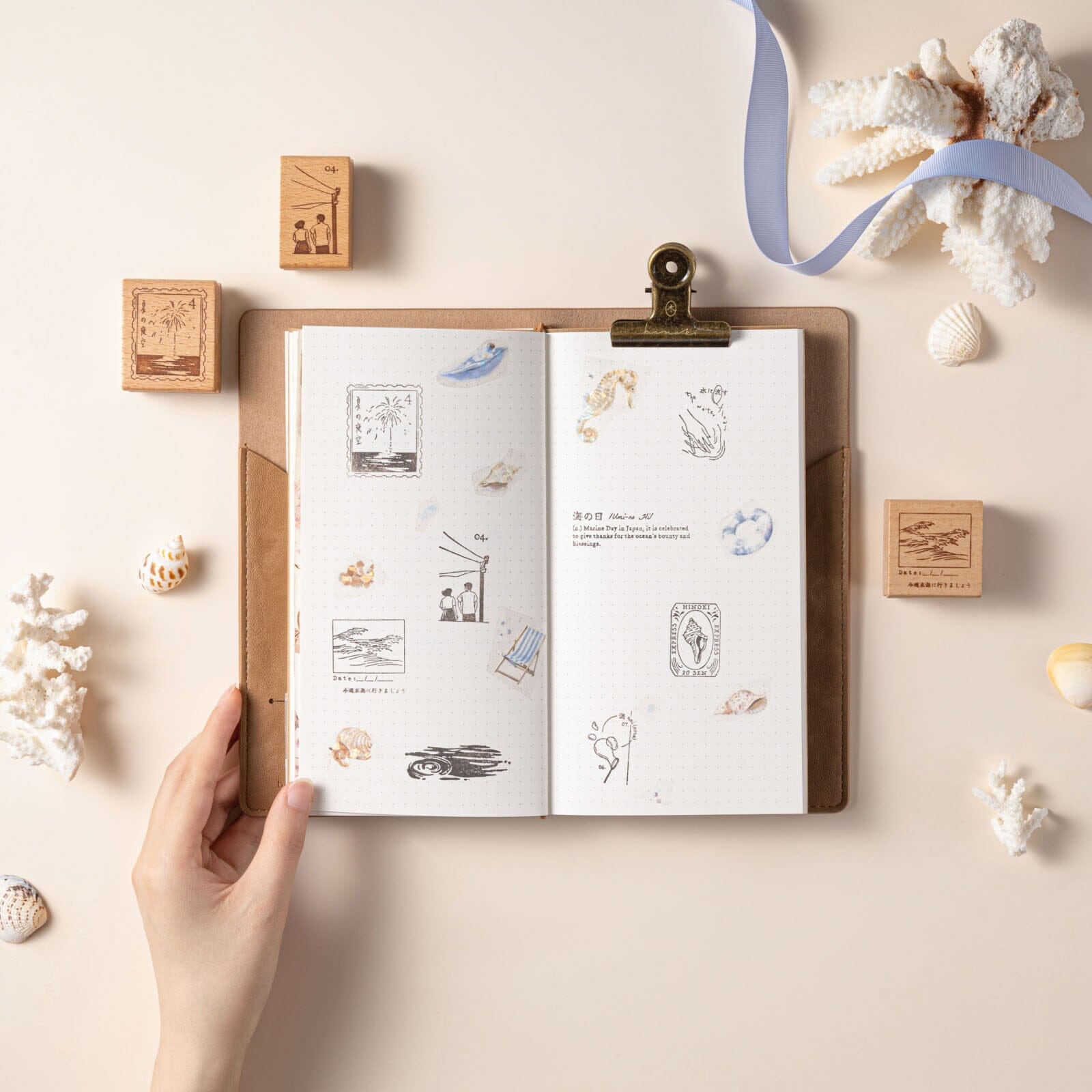 The elegant seaside + functional elements will take you to an uplifting Marine Day celebration - from the premium beech wood to the delicate designs. Feel the inner peace of the waves + the sea breeze and create your own unique Hinoki-style pages with these vintage aesthetic stamps.
