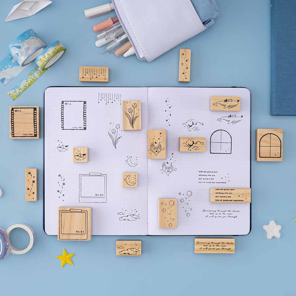 - 16x wooden stamp set, including: 2 x small decorative icon stamps, 2 x writing text stamps, 3 x functional frame stamps, 3x border decor stamps, 6 cloud dreamland icon stamps - add new patterns to your bujo spreads!