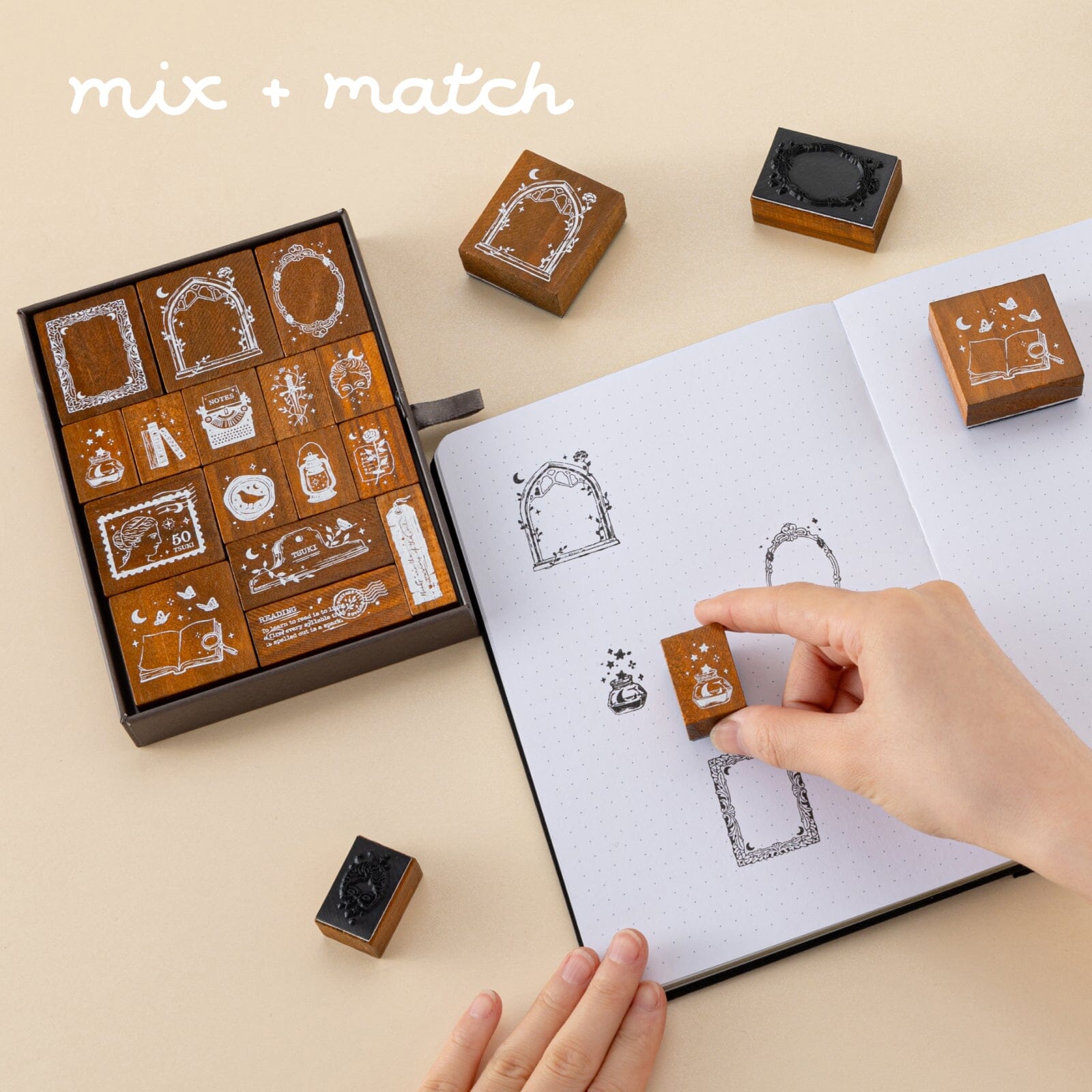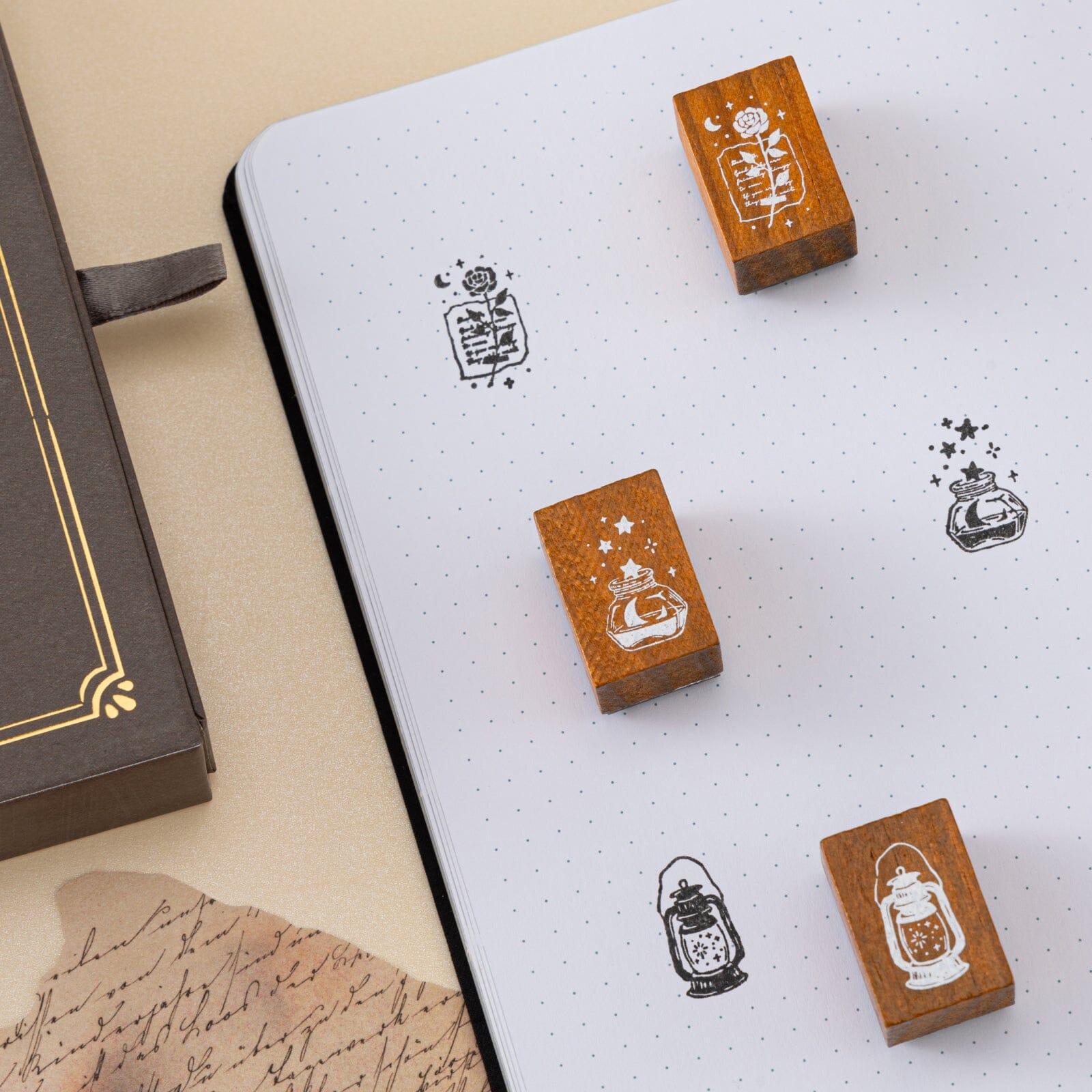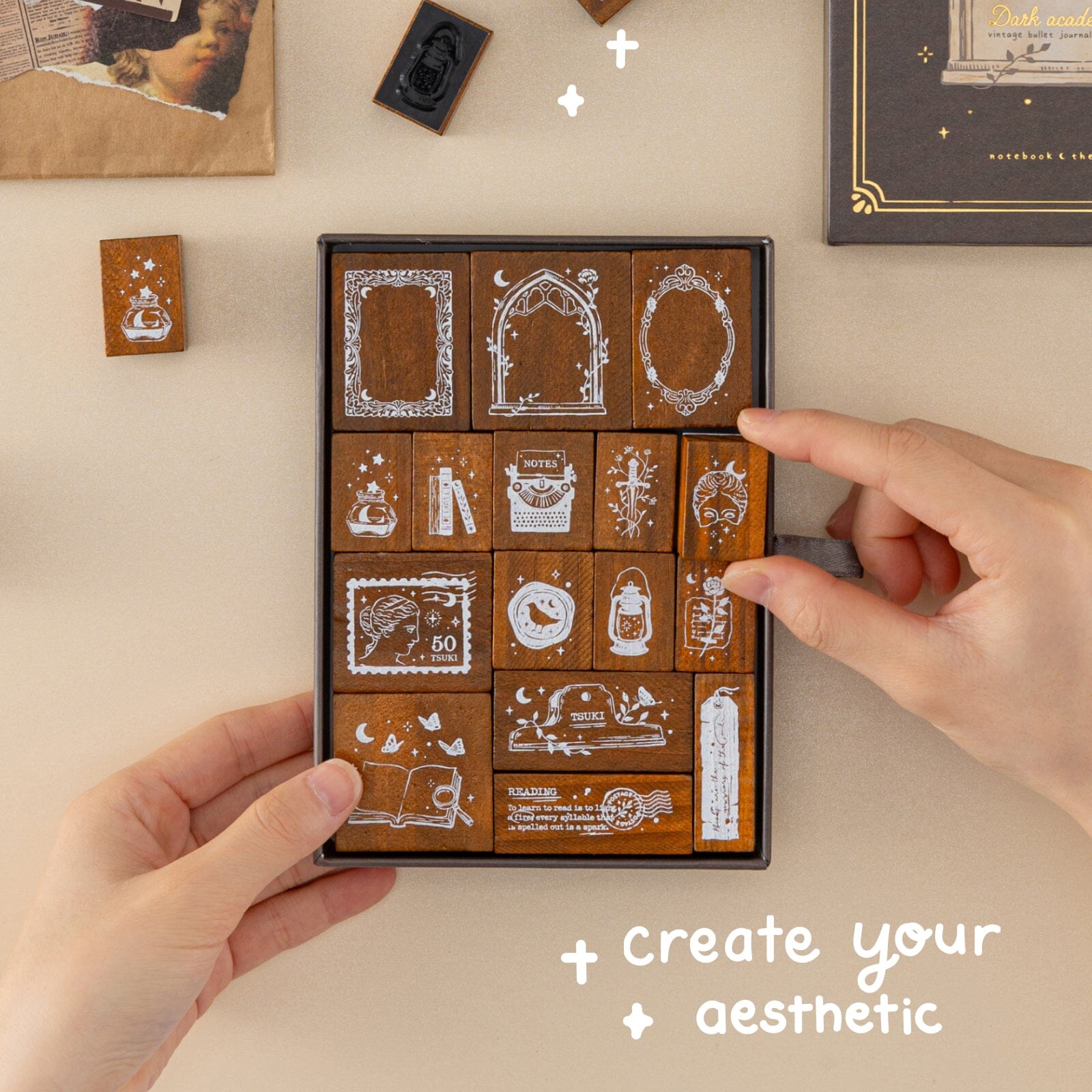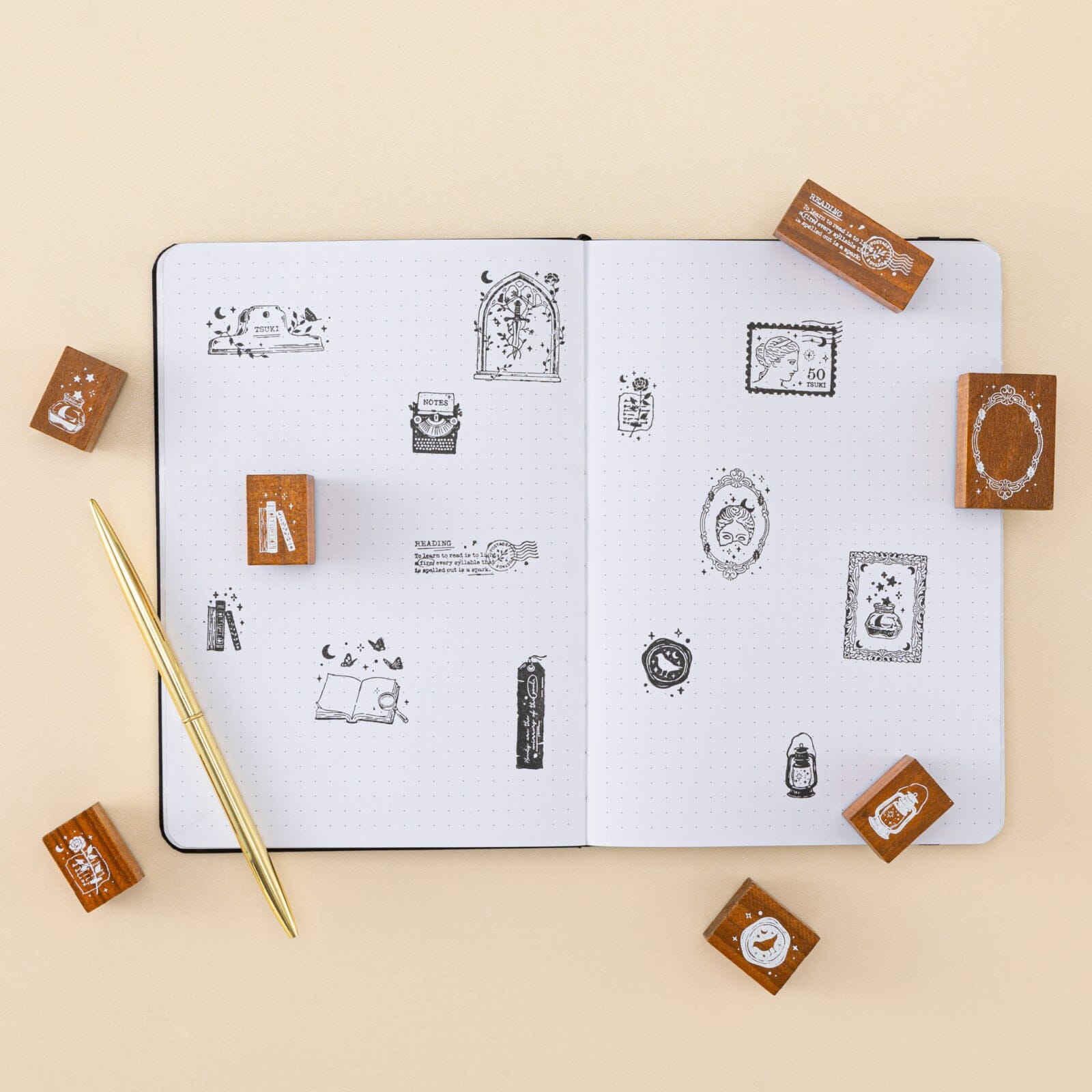Elevate your bullet journal with this exquisite dark wooden stamp set, featuring 16 vintage-inspired, academia-style stamps. Each design combines both functionality and elegance, perfect for adding a timeless, scholarly + gothic touch to your journaling + bullet journal spreads.