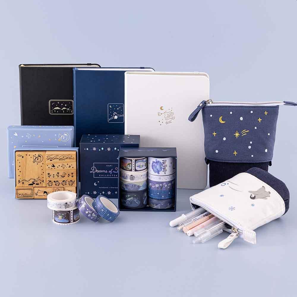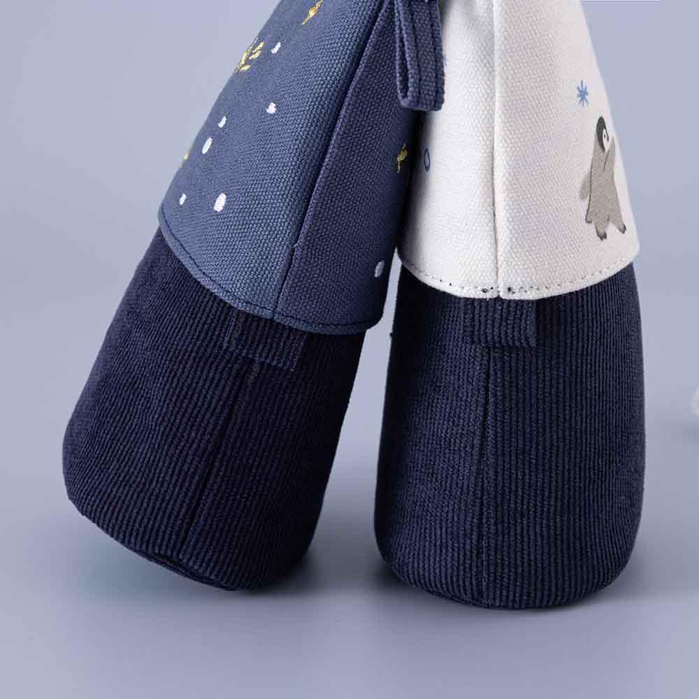 Bringing a magical winter aesthetic to our Tsuki line, these pencil cases are perfect for taking on the go, or popping down as a pen pot for your desk! Choose between a snow white + gold embroidered night sky design, or a cute printed pattern of our much-loved penguin friend playing in a wintery snowscape! Each design is made from strong canvas material + deep blue corduroy strong enough for holding all your stationery supplies. Match with other items from our Dreams of Snow Collection for the full experience!
