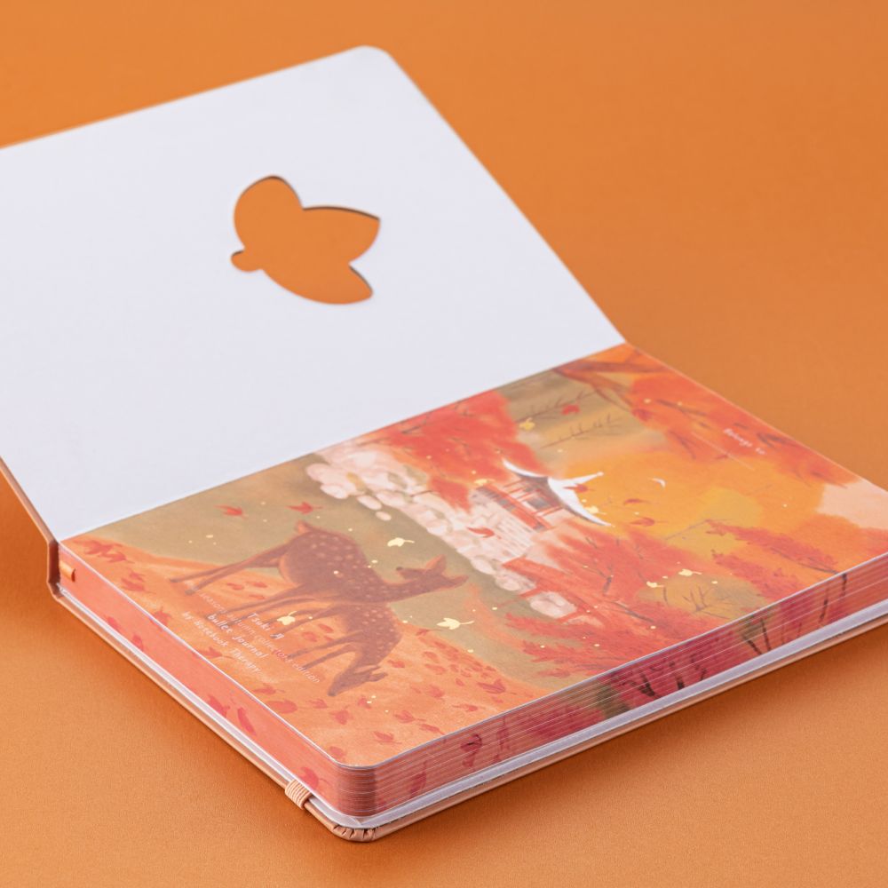 The final release in our special 2022 Four Seasons series, with the same unique cut-out cover as our Four Seasons Winter, Spring + Summer bujo! Experience a maple tree filled autumn’s day with this dreamy Nara inspired aesthetic! Open the soft orange cover to reveal a gorgeous autumnal scenery with the majestic deer and autumn leaaves + gold foil details, with our signature dot-grid notebook paper.