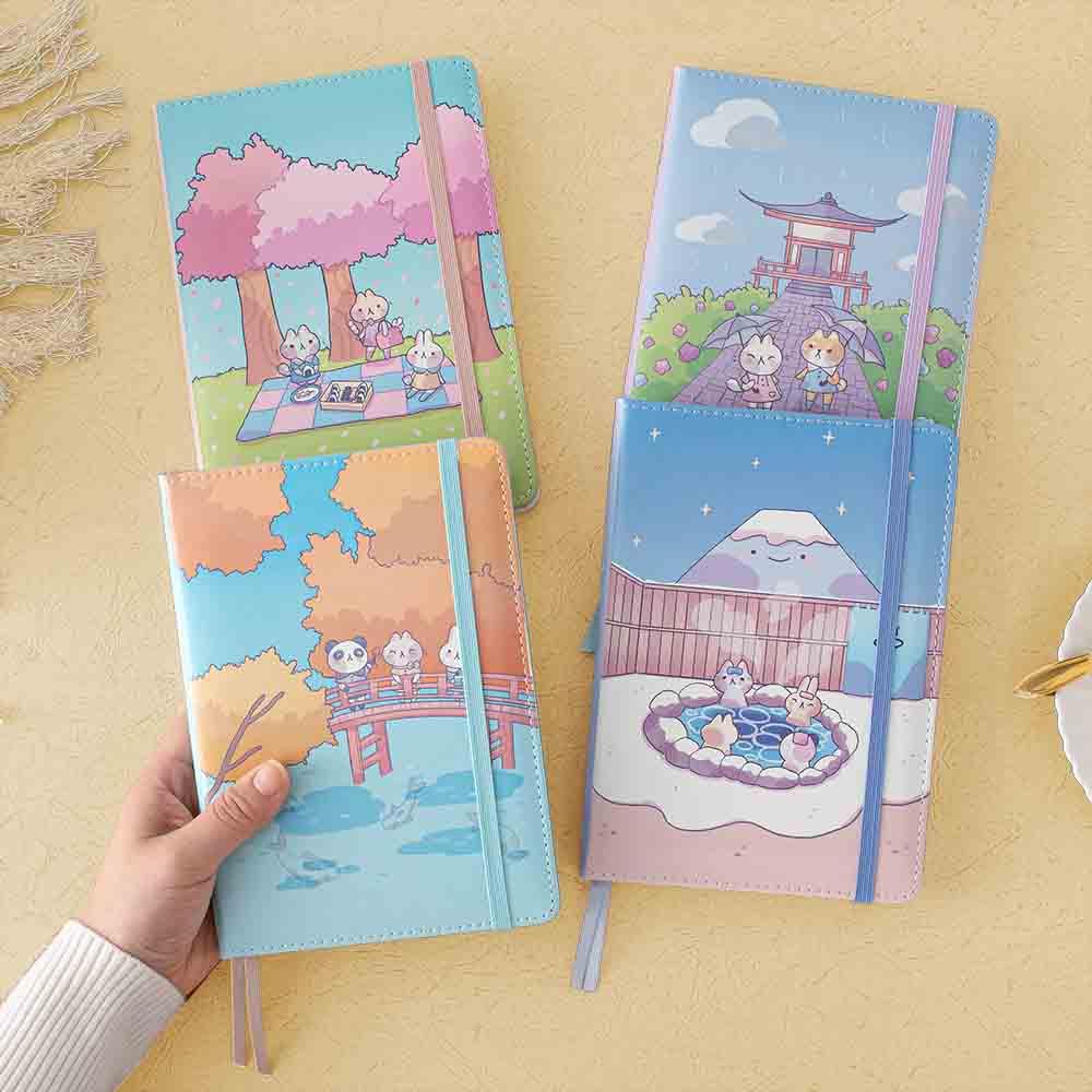 Our new Tsuki Autumn Edition bullet journal is here, just in time for autumn! Designed exclusively by the amazing @milkkoyo + inspired by the Japanese tradition of Momijigari. Also known as red leaf hunting, catch her cute animal friends enjoying the fall leaf colour on another adventure + watching a calming koi fish pond on our signature padded vegan leather cover! Fill the dot grid notebook paper with all your hopes, dreams + bullet journal ideas for the autumn season with this kawaii notebook by your side!