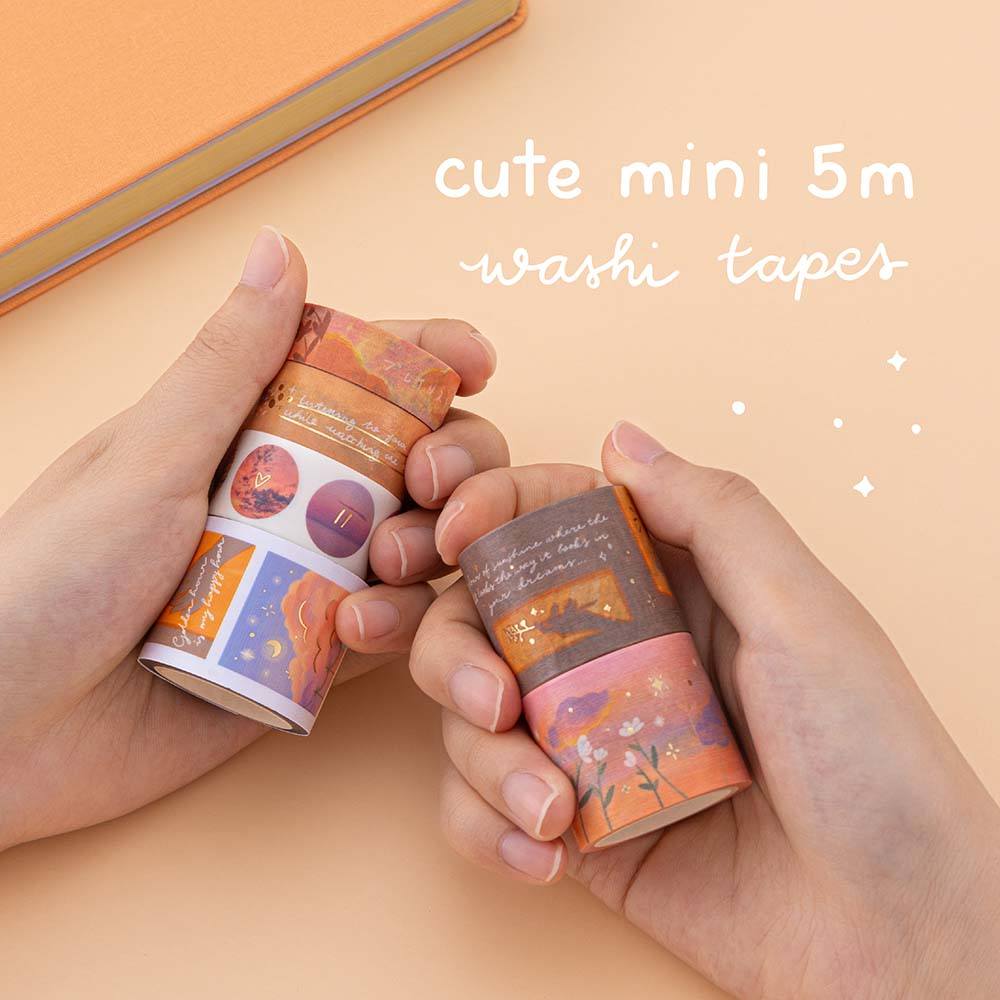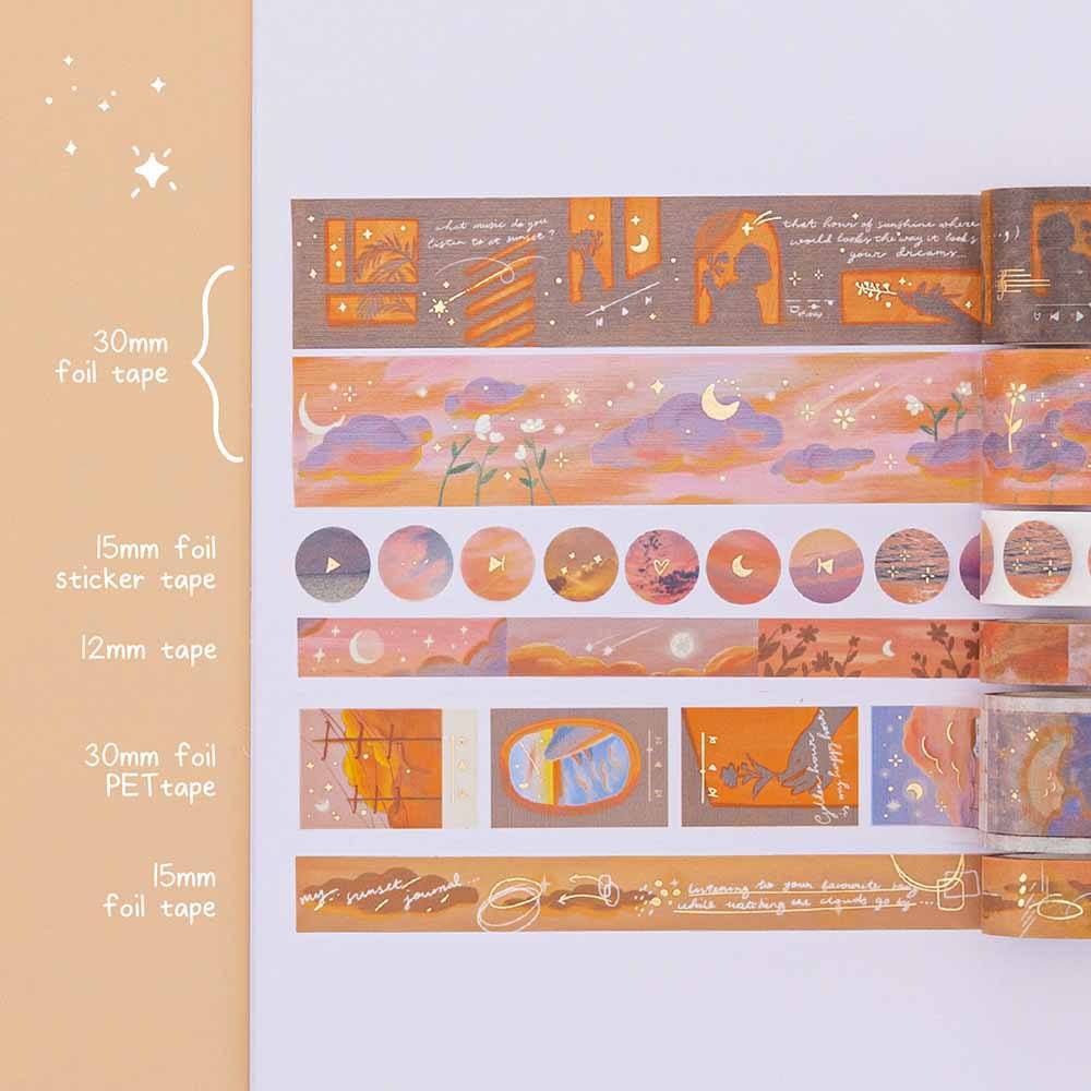 - 6x Washi Tapes - 5m length: 2x 30mm washi tape with foil details, 1x 30mm perforated matte transparent tape, 2x 15mm washi tape, 1x circle sticker roll
