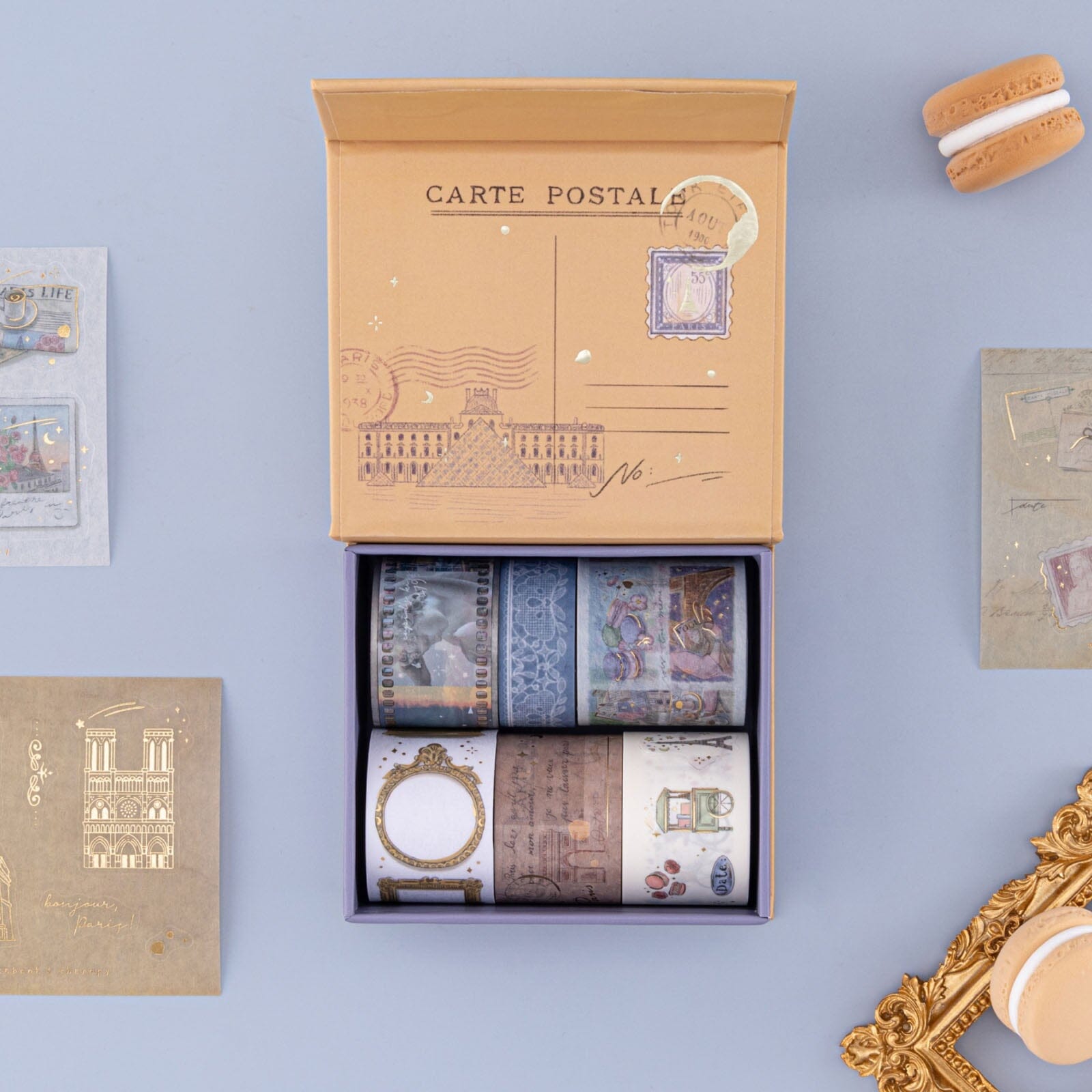 Paris-lovers will delight in opening our special eco-friendly gift box with magnetic closure to reveal six unique tapes, each decorated with intricate shimmery gold foil details + our French-inspired designs! From a functional frame tape to our Parisian scenery painting tape, the soft and colourful tones will brighten up any bullet journal, penpal letter or scrapbook.