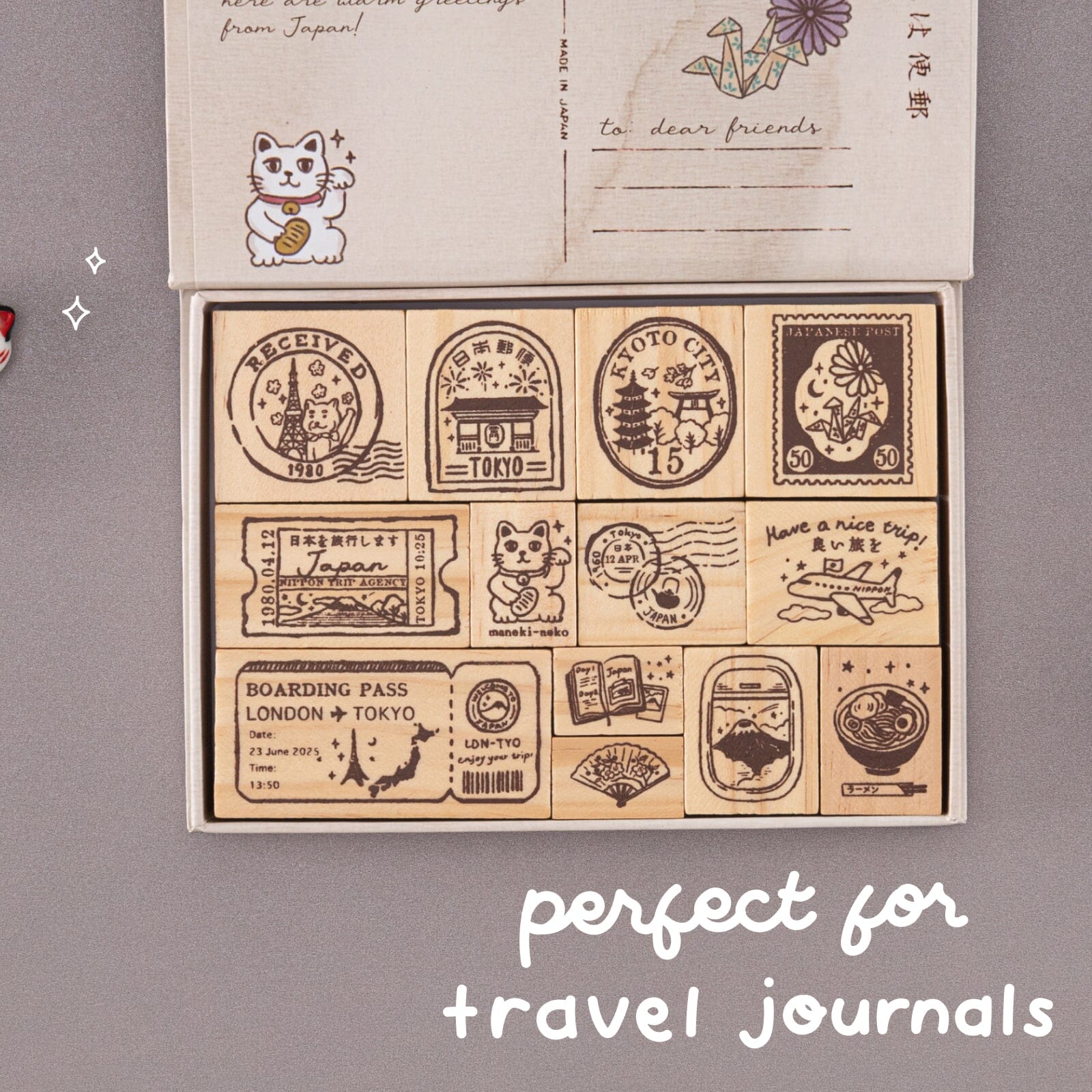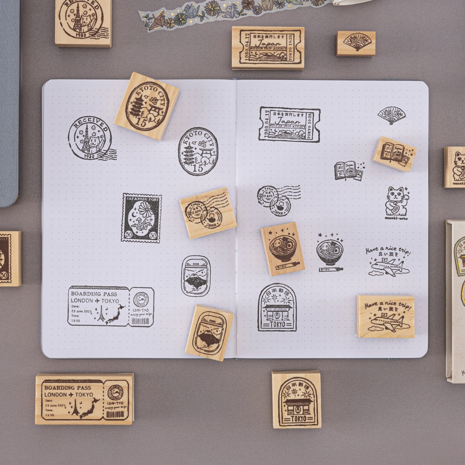 Part of our brand new Journey in Japan collection, this unique wooden stamp set is filled with 13x decorative + functional stamps with stationery illustrations to take you to Japan all packed in a beautiful postcard-style box. Designed to accompany you in your travels for easy bullet journal decorating on-the-go! To complete your studio aesthetic, match with our beloved Tsuki Journey in Japan washi tape set.