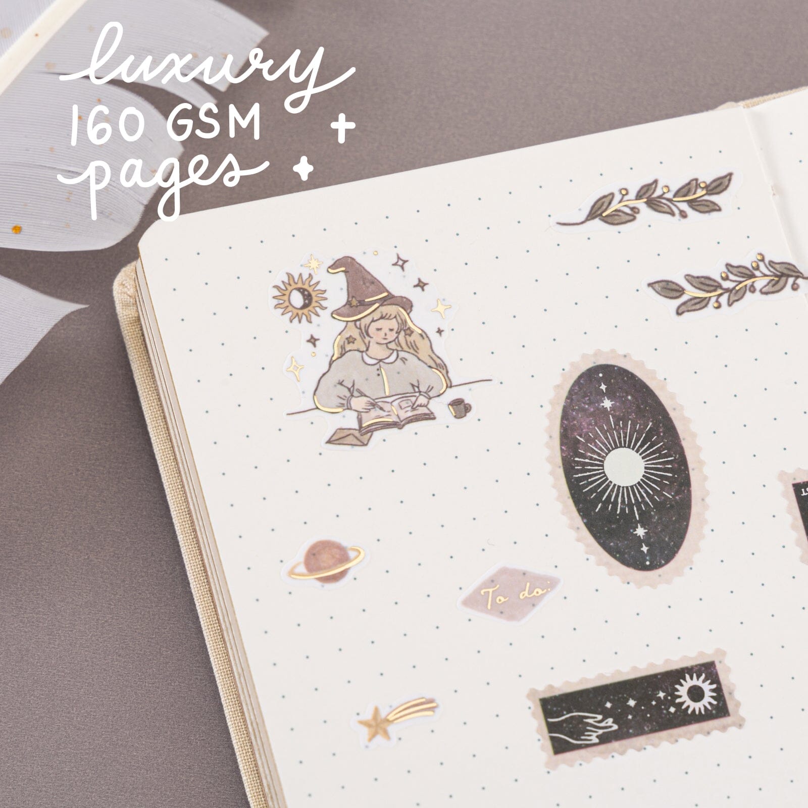 Enjoy a lunar calendar, a step-by-step guide to manifestation, and a dedicated moon manifestation log - all thoughtfully curated for our witchcore enthusiasts. Plus, with 120 pages of dot grid paper, you’ll have plenty of room to let your imagination soar and bring your magical visions to life. Wrapped in soft cream linen, adorned with gold foil details, + a window cutout, stored in a special edition gift box.