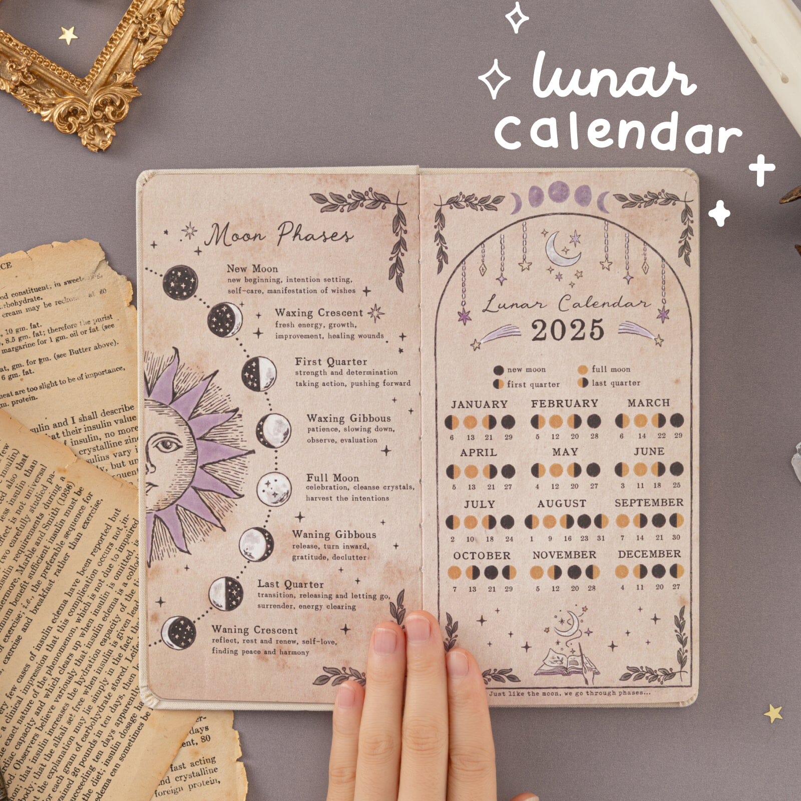 - Special moon manifestation pages - 1x About Me double page spread, 1x Affirmations for 2025 double page spread, 1x Phases of the Moon page, 1x Lunar Calendar page, 1x How to Manifest double page spread, 16x Moon Manifestation pages + 120 pages of dot grid pages