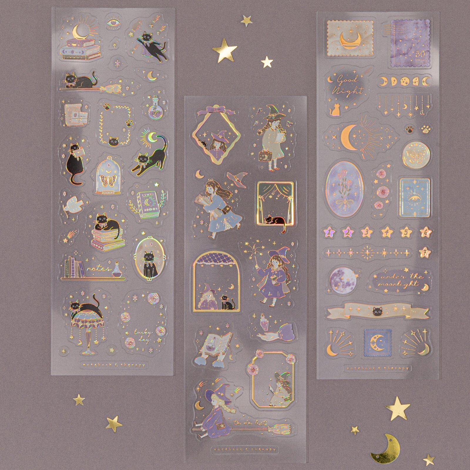 Tsuki ‘Lunar Delivery’ 3D Holo Foil PET sticker sheets are perfect for decorating your penpal letters, bullet journals, scrapbooks and junk journals with magical witch + cat illustrations perfect for Halloween.