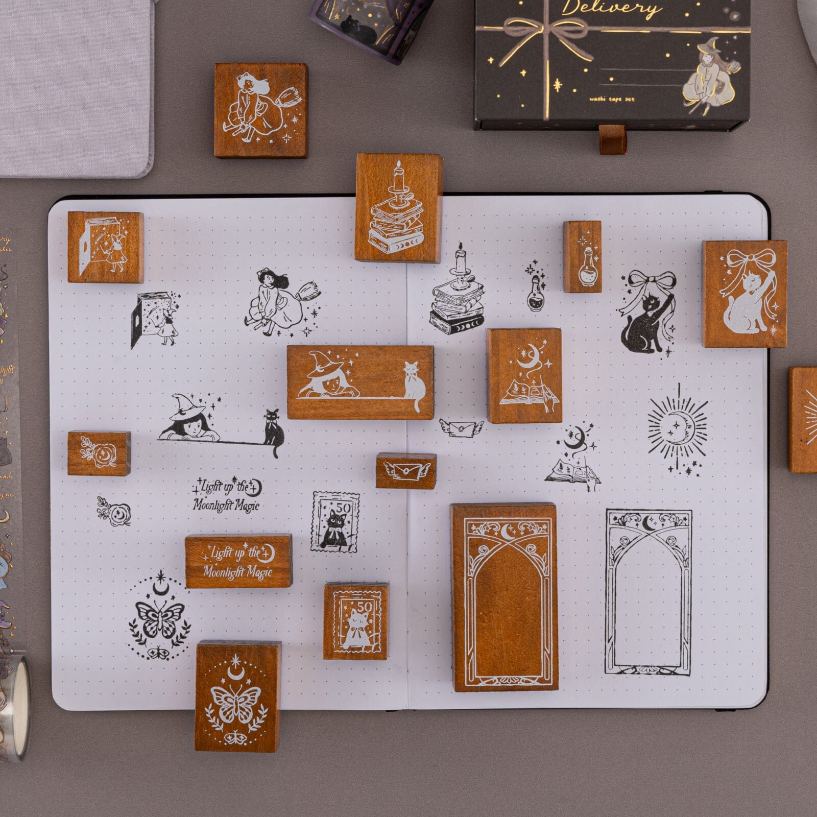 - 14x wooden stamp set, including: 1x functional frame stamp, 1x text stamp, 3x small icon stamps, 1x postage stamp stamp, 1x witch + cat border stamp, 7x magical decorative - add new patterns to your bujo spreads!