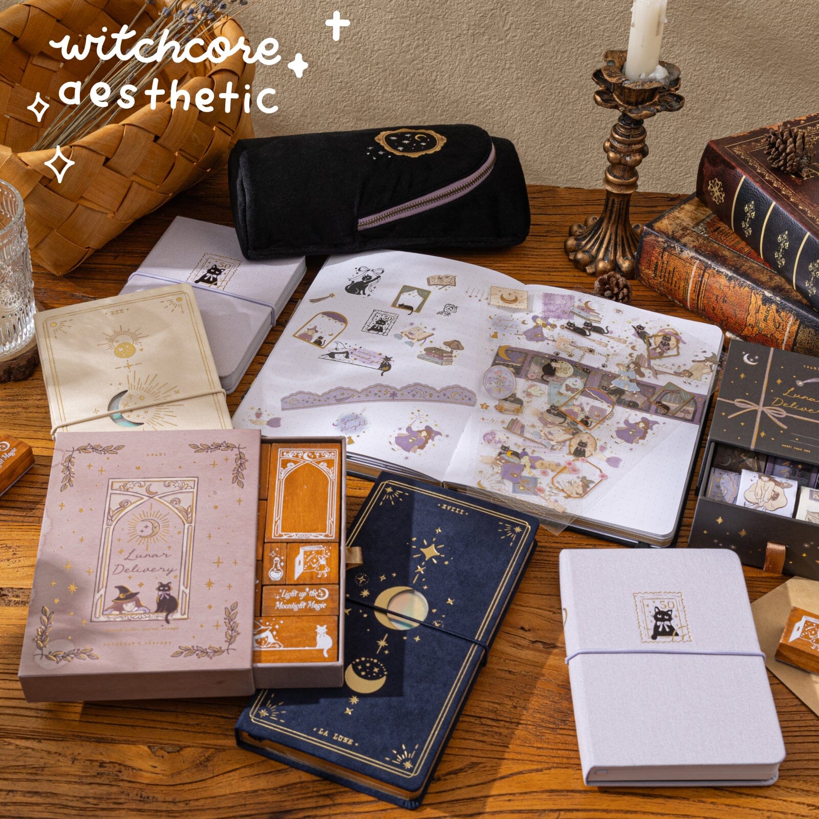 Part of our brand new Lunar Delivery collection, this unique wooden stamp set is filled with 14x decorative + functional stamps with cat + witch illustrations designed to help you add a magical + Halloween flair to any bujo spread! To complete your witchcore aesthetic, match with our beloved Lunar Mystery washi tape set.