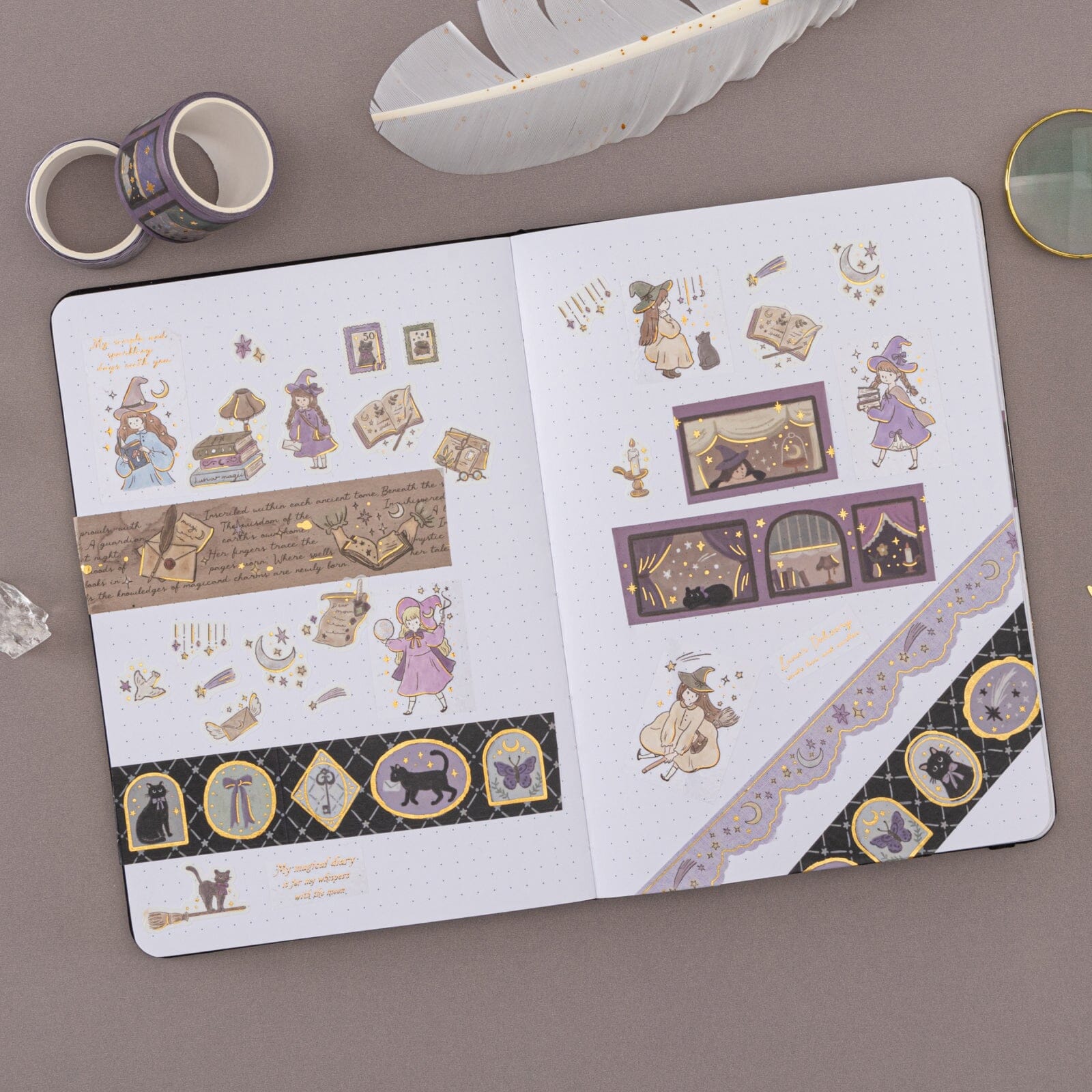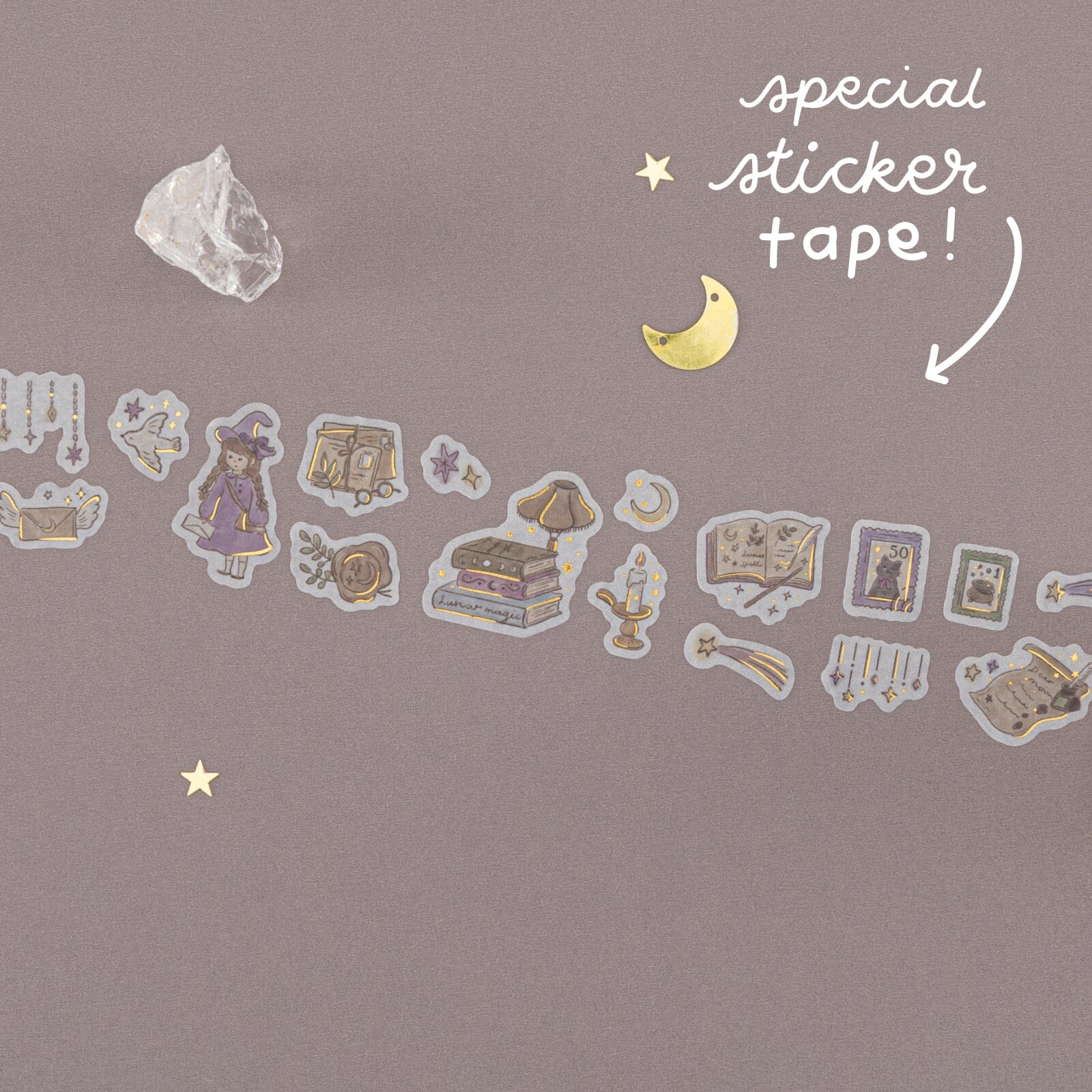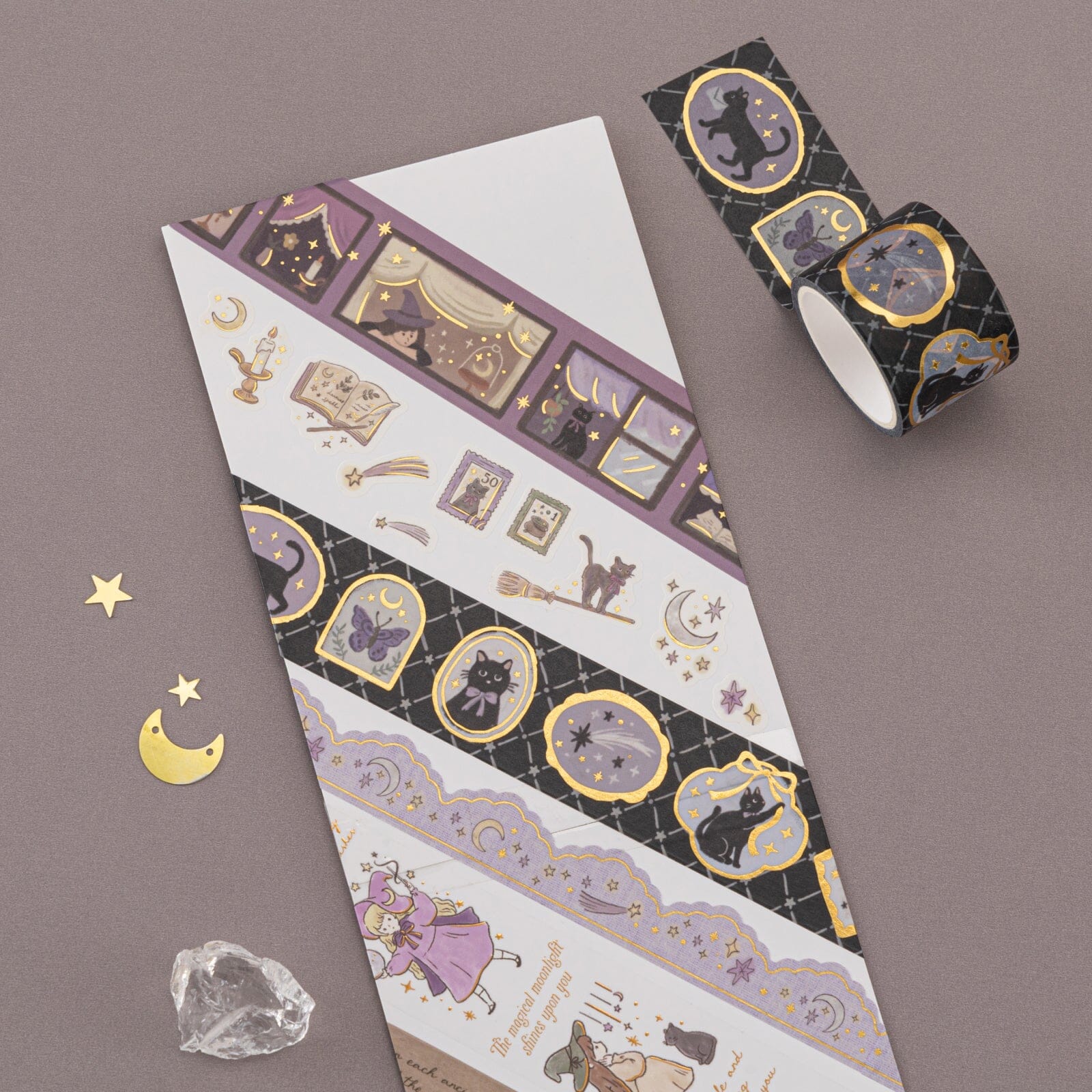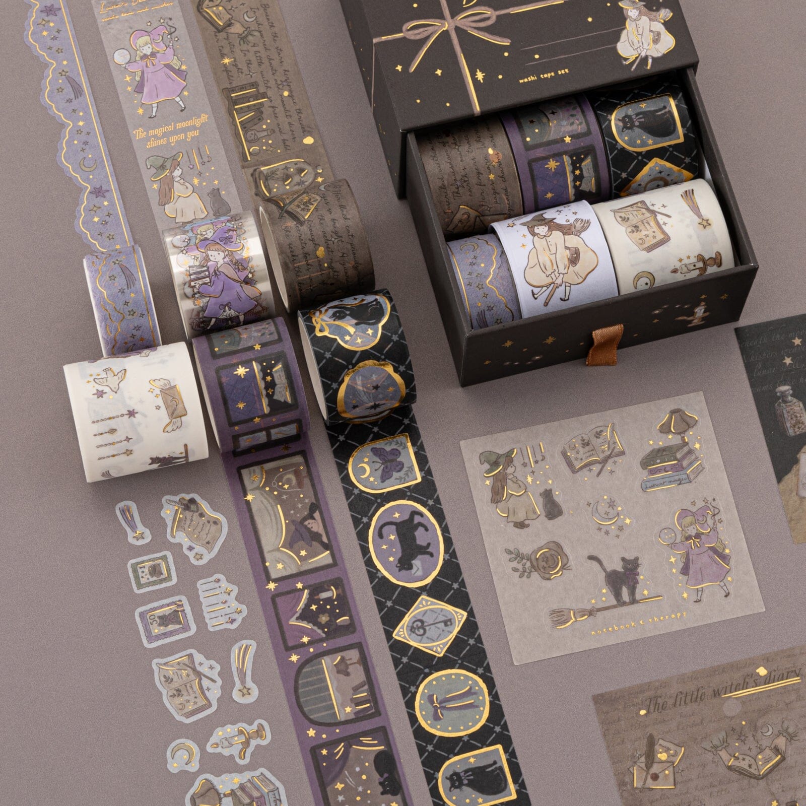 Magic lovers will delight in pulling open the eco-friendly drawer box to reveal six unique tapes, each decorated with witchy illustrations + 6x tapes with intricate shimmery gold foil details. From a sticker roll to a unique 3D foil PET tape, these ethereal tapes will light up any bullet journal, penpal letter, or scrapbook.