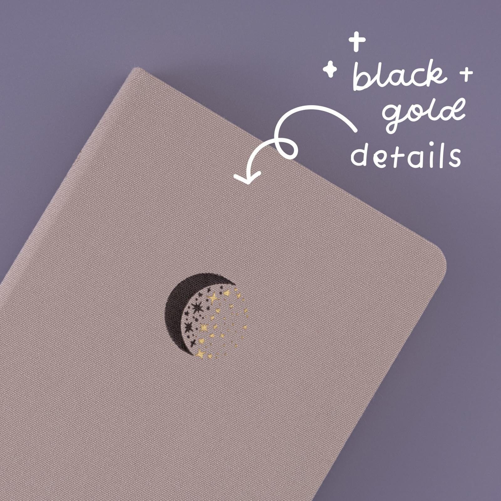 Write down your positive affirmations and favourite spells + manifest your dreams with the magic of the moon in this stunning bullet journal! Decorated with a moon design in black + gold foil on a dusky lilac linen fabric. Store your best bullet journal ideas between the luxurious etched gold page edges + make a wish with the star paperclip to help all your dreams come true…