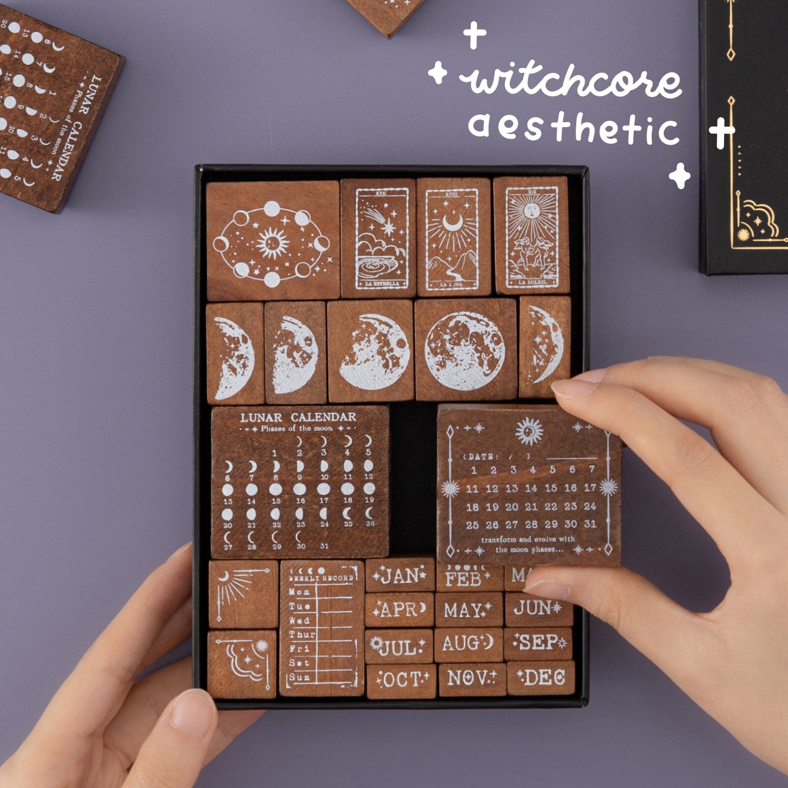 Part of our brand new Lunar Mystery collection, this unique wooden stamp set is filled with 26 witchy aesthetic + functional stamps designed to help you add a magical + vintage flair to any bujo spread! To complete your witchcore aesthetic, match with our beloved Lunar Mystery washi tape set.