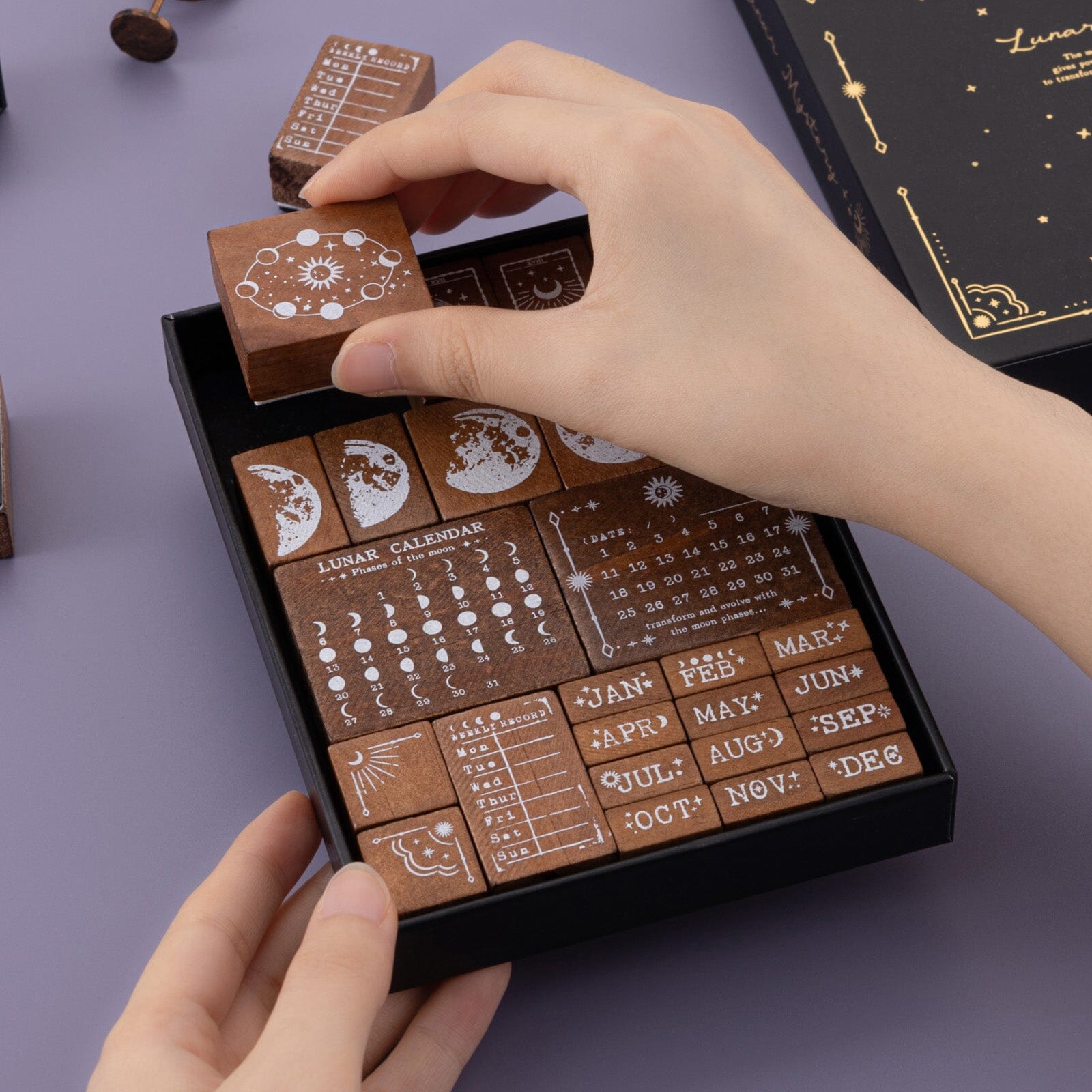- 26x wooden stamp set, including: 6x decorative stamps, 5x moon phases stamps, 1x lunar calendar stamp, 1x functional calendar stamp, 1x weekly tracker stamp, 12x monthly header stamps - add new patterns to your bujo spreads!