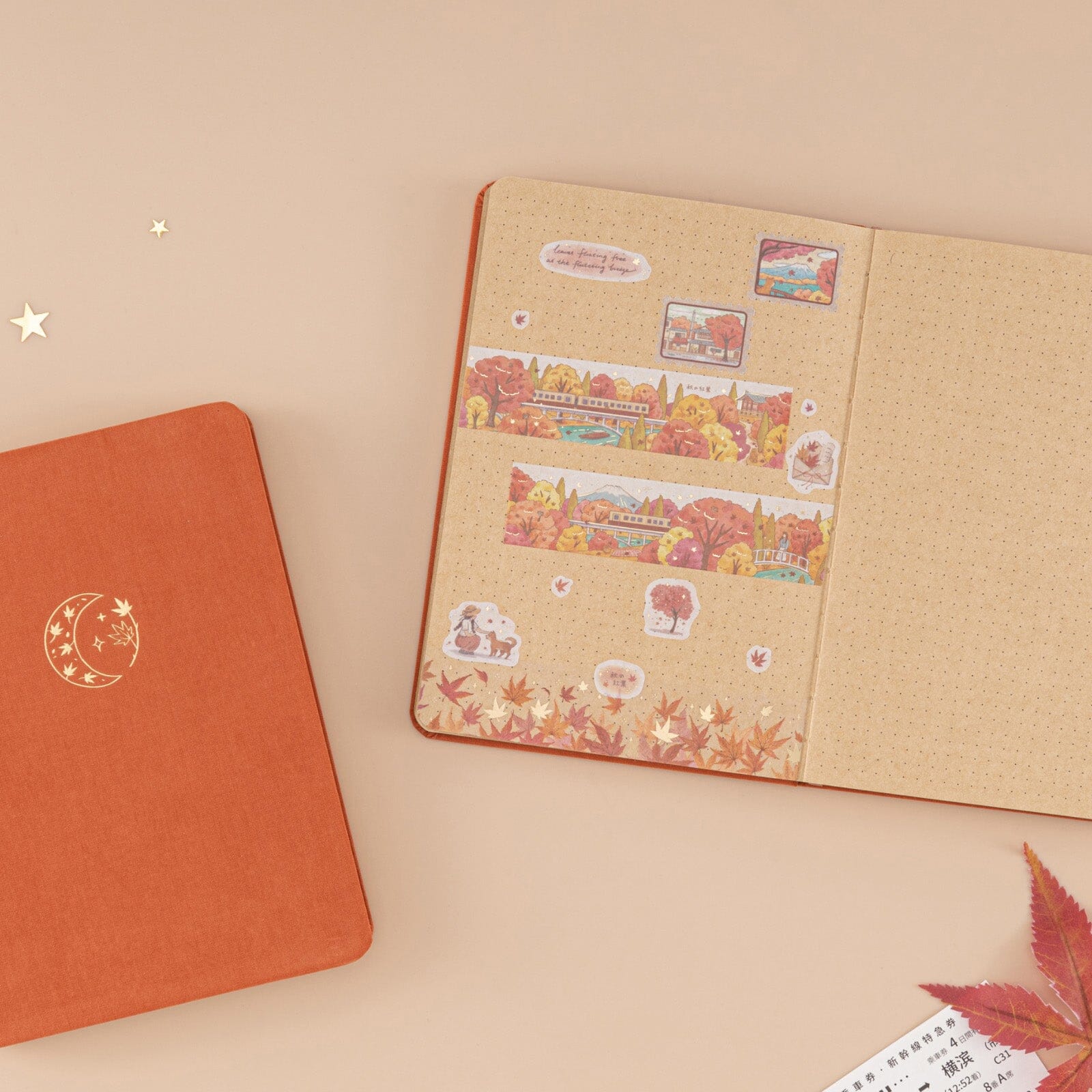 Use the ultra-thick kraft dot grid notebook paper to add a vintage aesthetic feel to your bullet journal spreads + scrapbook! Inspired by the beautiful autumn night, this exclusive Tsuki kraft paper edition of our Maple Moon Bullet Journal make for the perfect autumn scrapbook.