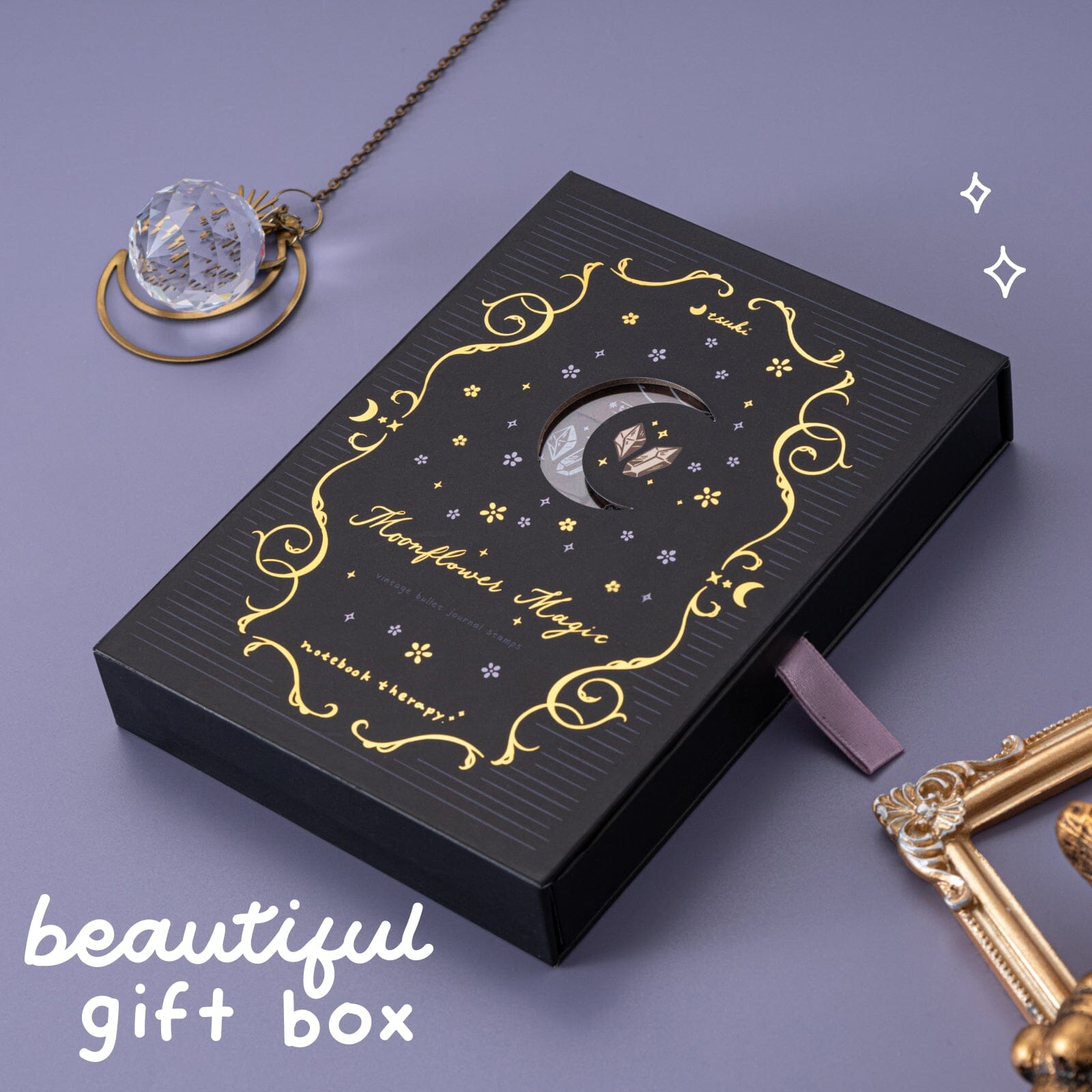 Part of our brand new Tsuki Moonflower Magic collection, this unique wooden stamp set is filled with 19x decorative + functional stamps with crystal + celestial elements encased in a beautiful gift box to bring you some magic into your everyday journaling. Designed to help you decorate your notes, journals and penpal letters! To complete your witchy aesthetic, match with our beloved Tsuki Moonflower Magic Washi Tape Set.