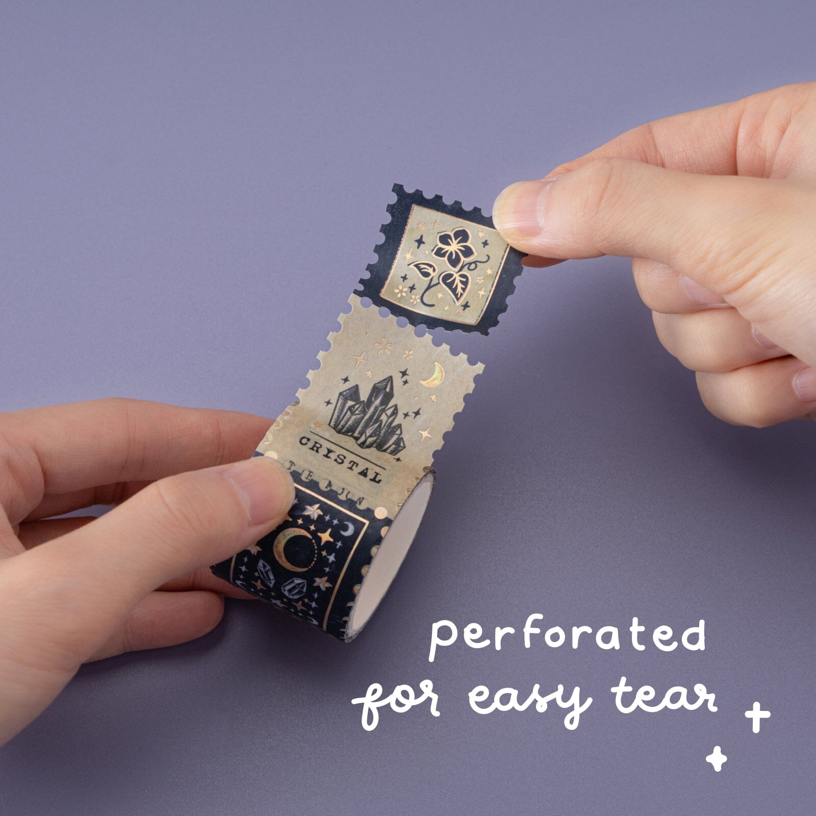 Magic lovers will delight in opening the special gift box to reveal seven unique tapes, decorated with the witchy crystals, flowers + celestial elements! From moon phases with delicate gold foil details to intricate stamp tapes with vintage moon sun + moon illustrations, every design is made to wrap your days with enchantment and light up any bullet journal, penpal letter or scrapbook.