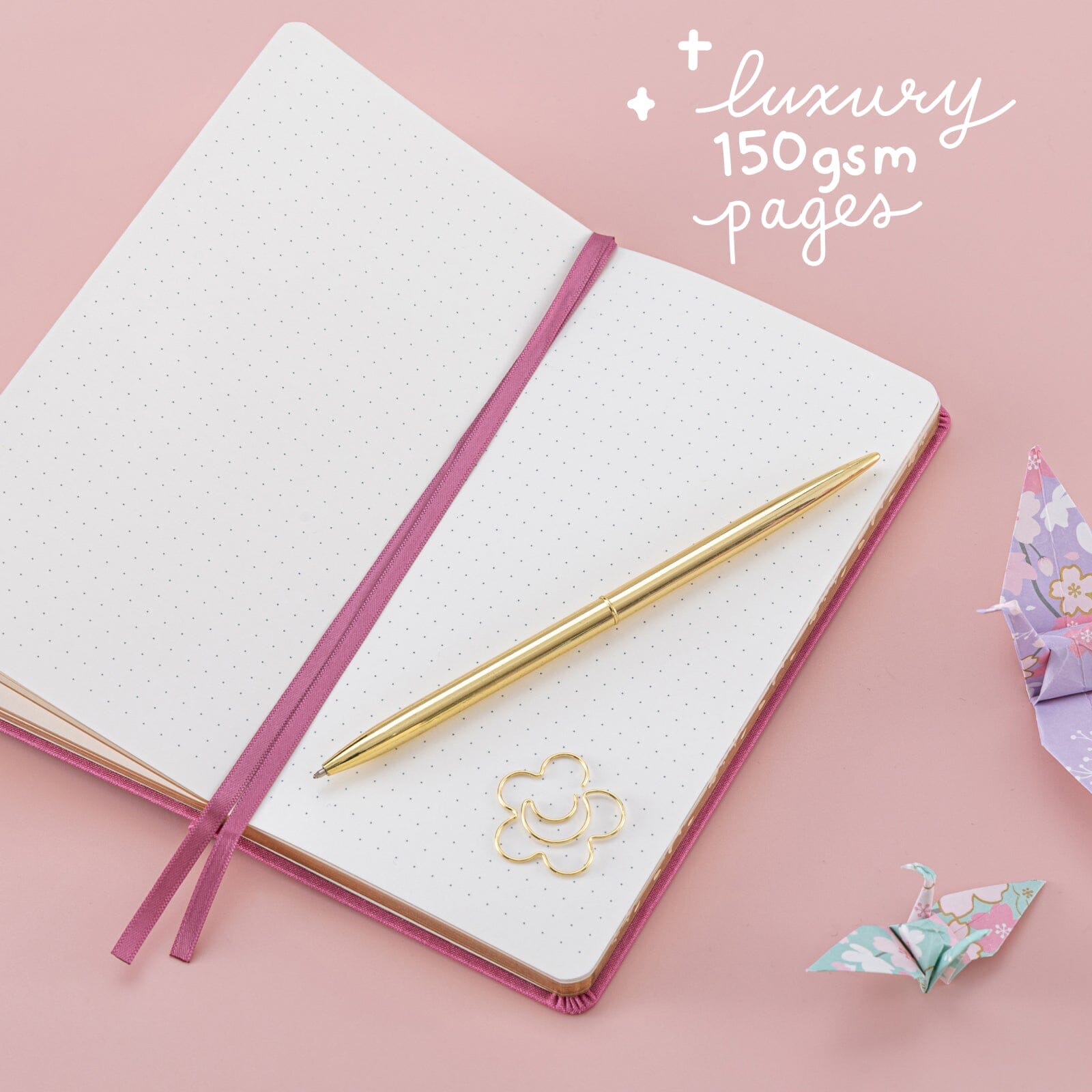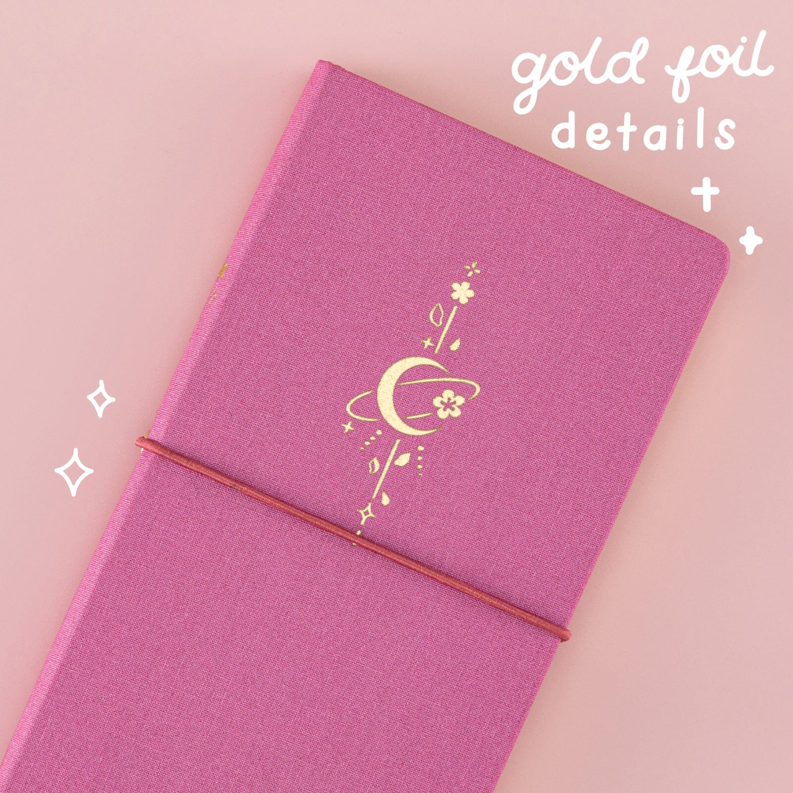 Perfect for preserving your cherished moments, the dot grid pages invite you to sketch, plan, and document every detail of your journey. Compact and lightweight, it’s ideal for journaling wherever inspiration strikes. Open the dreamy, gold foil accented deep pink linen cover and let your memories bloom endlessly. This elegantly crafted notebook features a deep pink linen cover adorned with a delicate gold foil cherry blossom + moon design, capturing the magic of sakura petals shimmering under the moonlight.