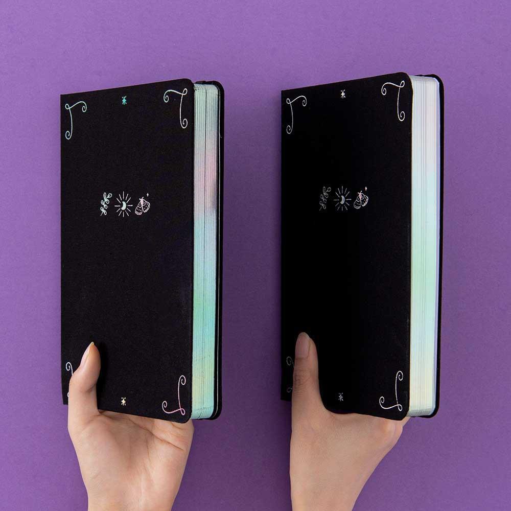 Create your very own spellbook with this magical new bujo! Decorated with a beautiful botanical design, our team imagines an exclusive Halloween theme on super-sleek midnight black linen fabric. Store your best bullet journal ideas between the holographic foil page edges + look into the mystical crystal ball bookmark to help all your Halloween wishes come true...