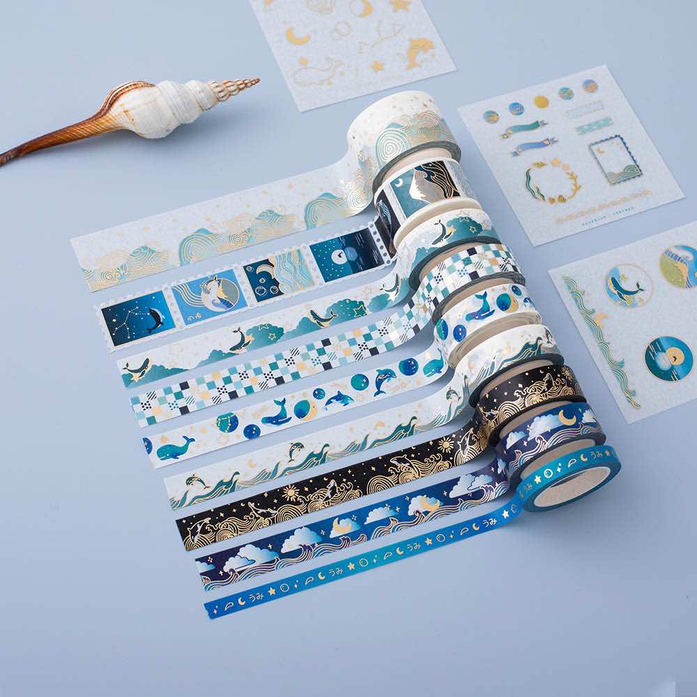 - 6 illustrated 15mm gold foil tapes, 1 functional circle tape, 1 thin 7.5mm gold foil tape + 1 thick 30mm ocean wave sticker tape + 1 ocean themed stamp washi tape - perfect for adding new textures + tones!