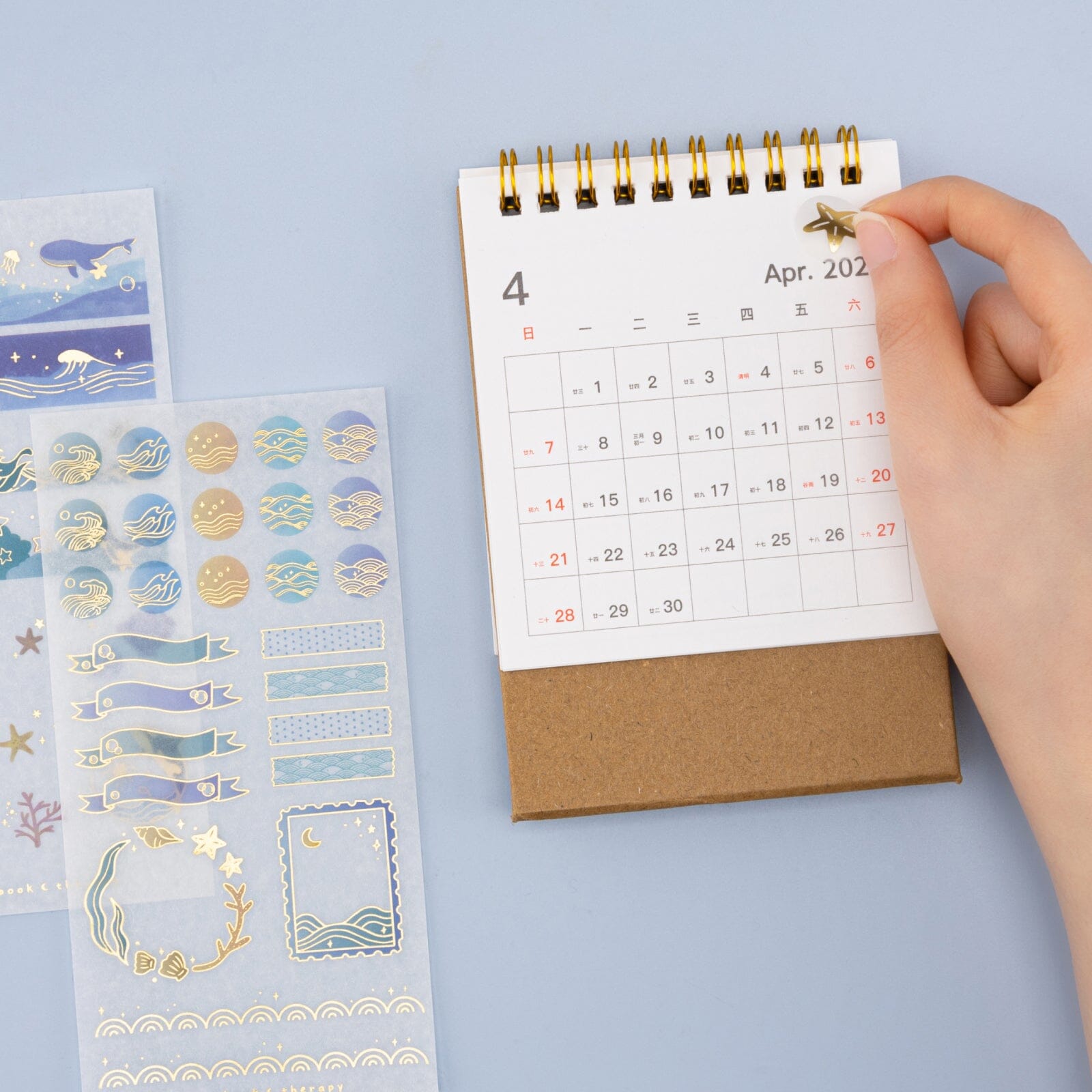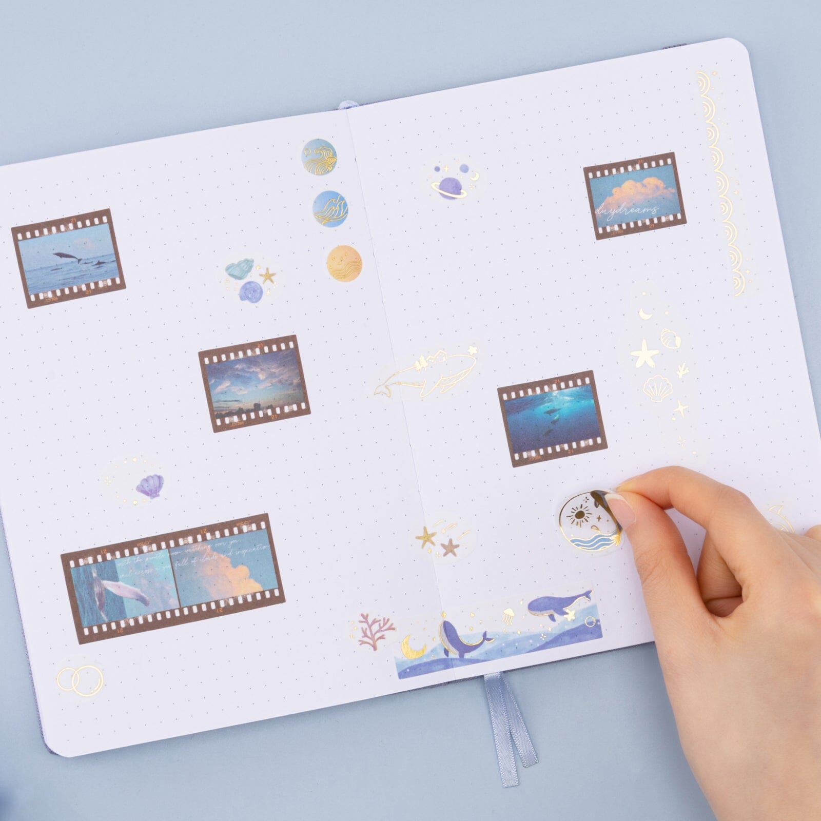 This set has 6 beautiful sheets featuring 4x gold foil detailed sticker sheets, 1x film roll washi sheet, 1x ocean with constellations washi sheet (8 x 16cm).