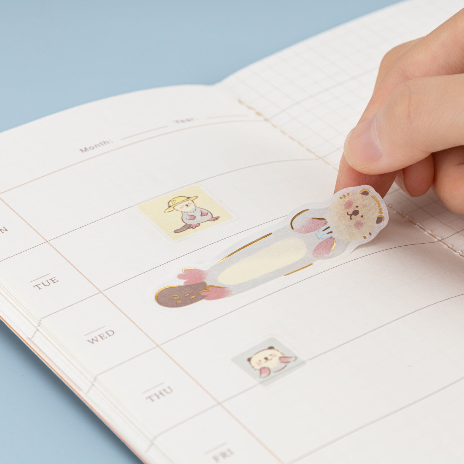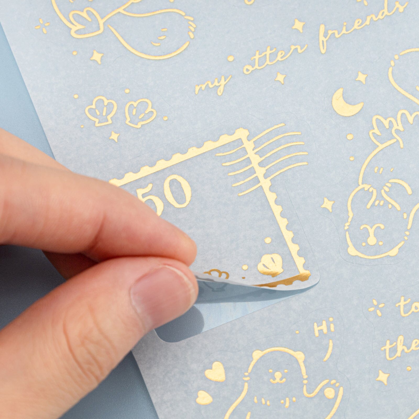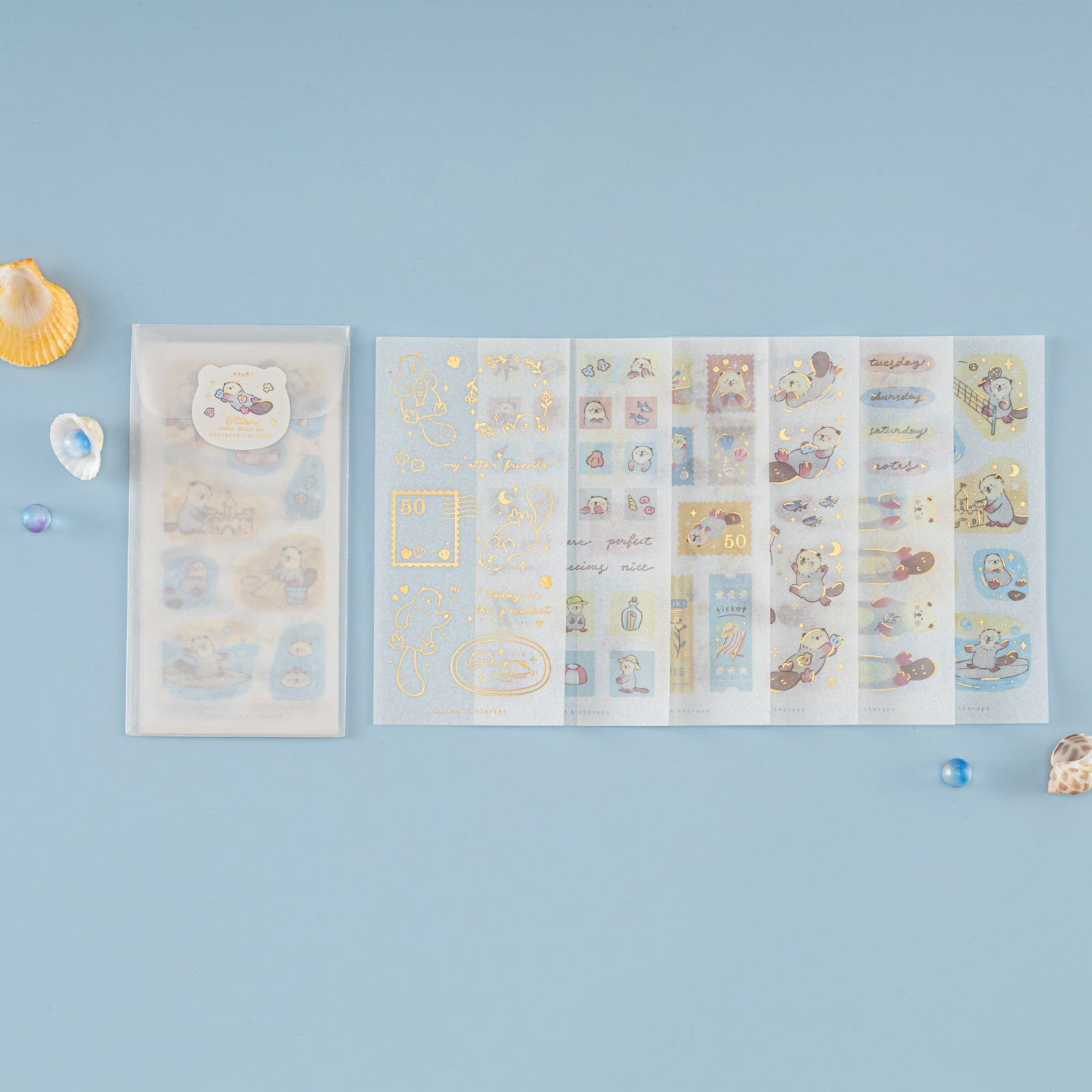 This set has 6 beautiful washi-style sheets including 3x cute otter sticker sheets with gold foil details, 1x gold foil sheet, 1x functional sticker sheet with gold foil details, and 1x otter icon sticker sheet (8 x 16cm)