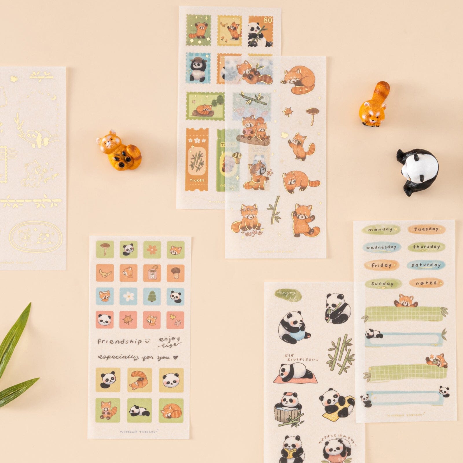 This set has 6 beautiful washi-style sheets including 1x gold foil sheet, 1x cute panda + red panda icon sticker sheet, 1x stamp + ticket themed sheet with gold foil details, 1x red panda themed sheet with gold foil details, 1x panda themed sheet, 1x functional sticker sheet with gold foil details(8 x 16cm)