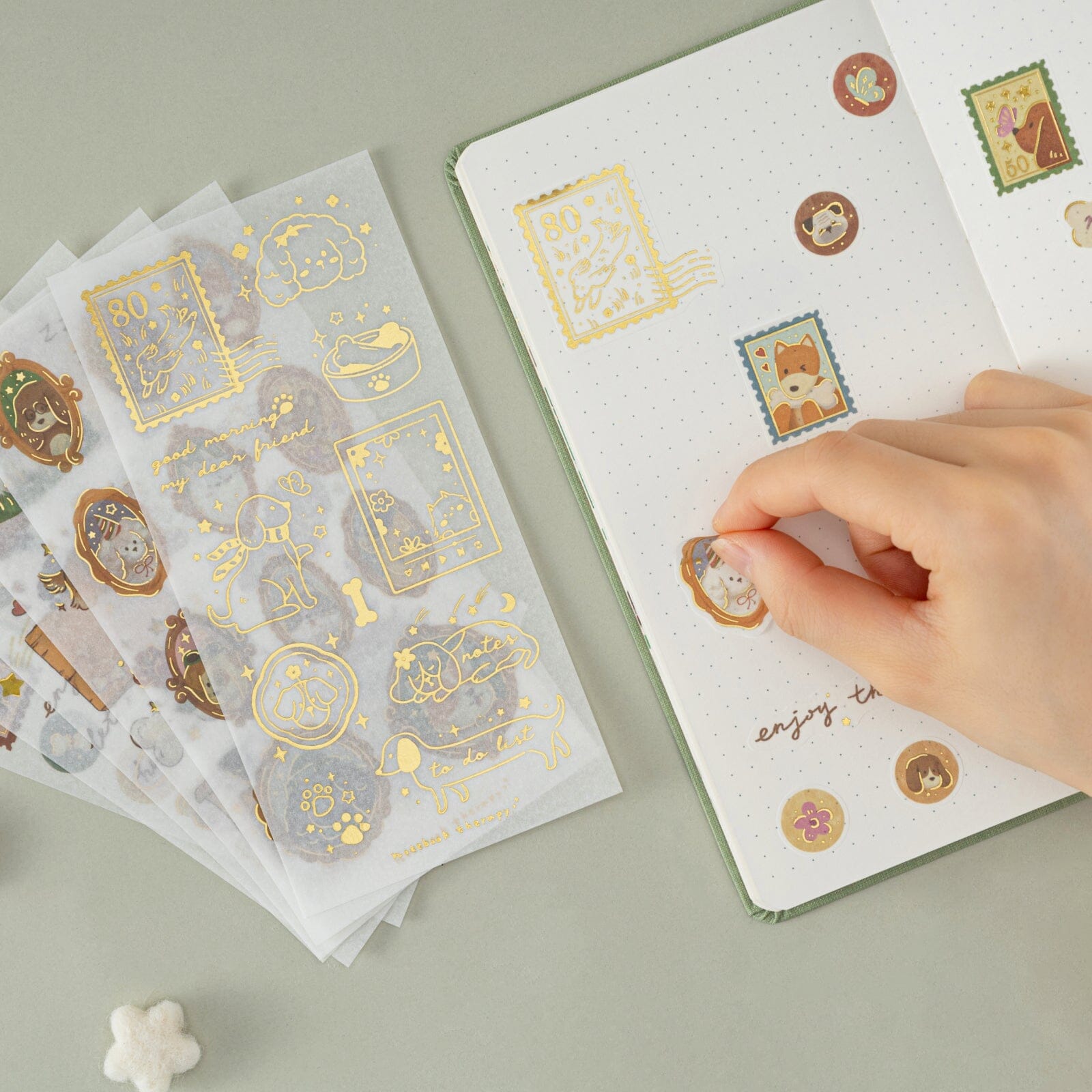 This set has 6 beautiful washi-style sheets including 1x gold foil sheet, 1x dogs in picture frames sheet, 1x fun puppy illustration sticker sheets, 1x label sheet, 1x functional sheet, 1x stamps and icons sheet (8 x 16cm)