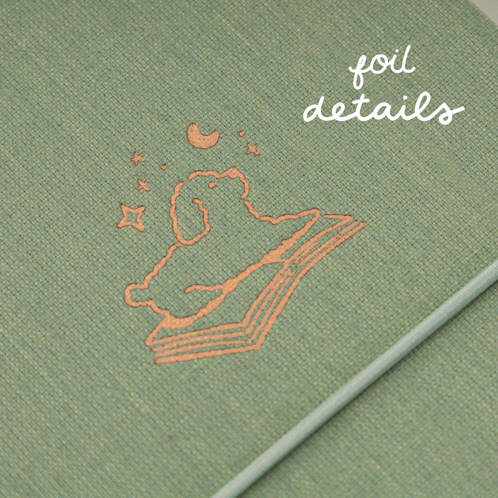 - Soft teal linen cover with brown foil puppy design - high quality, durable + sustainable