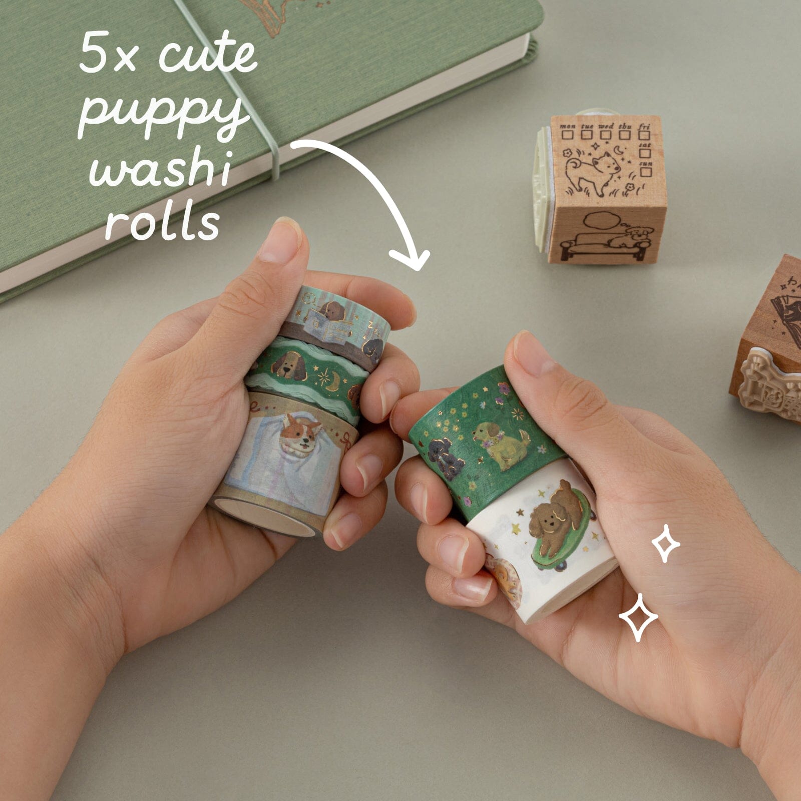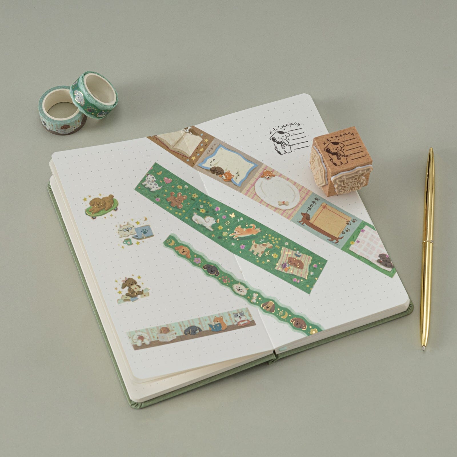 - 5x puppy washi tapes include: 30mm gold foil washi tape, 30mm writing tape, 30mm gold foil washi sticker roll, 15mm gold foil tape, 15mm lace foil washi tape