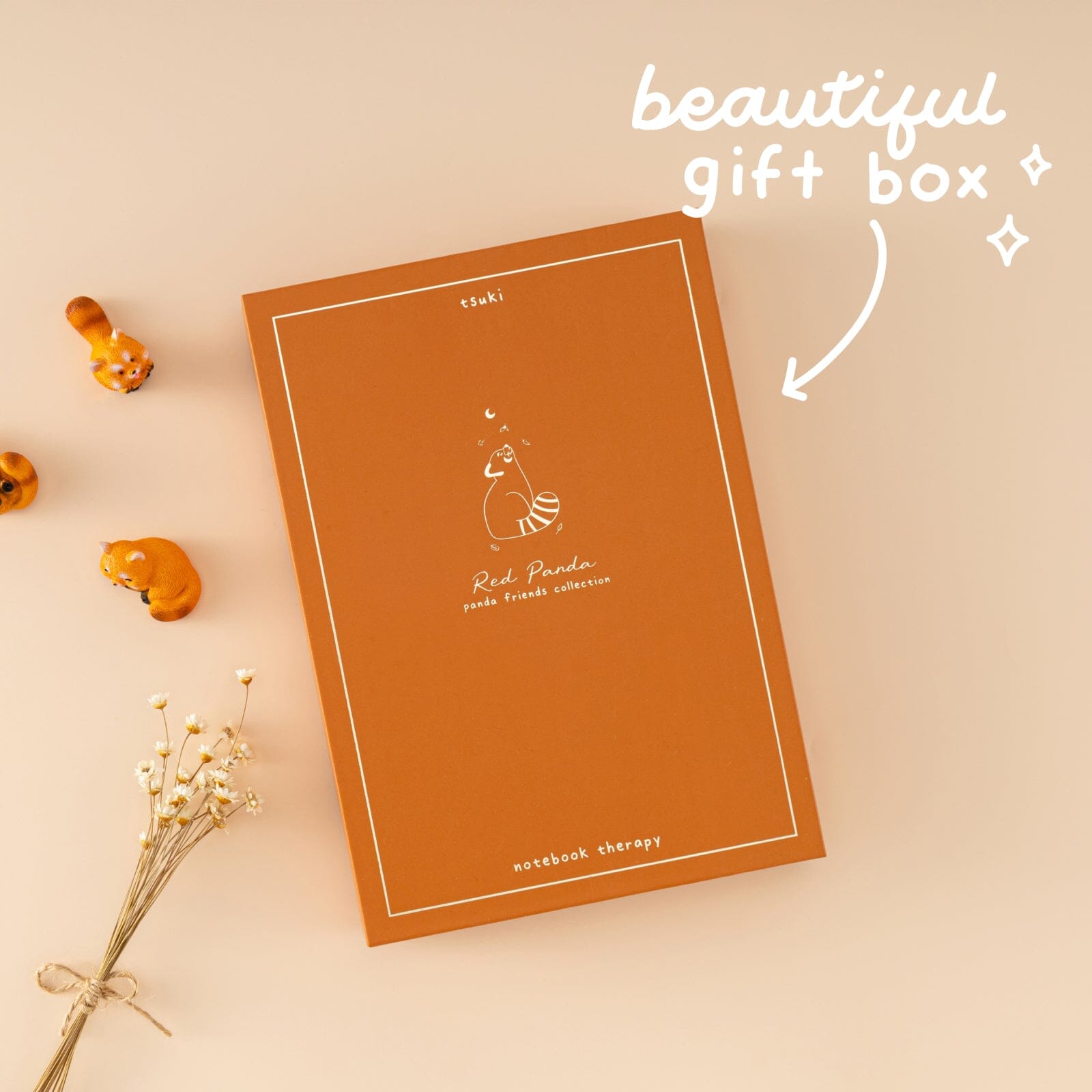 Meet another addition to our cute tsuki animal friends! Inspired by the adorable and curious red pandas, our Tsuki 'Red Panda' Bullet Journal features a beautiful orange linen cover with intricate gold foil detail. This charming addition to the beloved "Tsuki Collection of 160GSM dot grid notebooks showcases a playful red panda playing with the falling leaves, making it the perfect choice for animal enthusiasts and nature lovers alike!