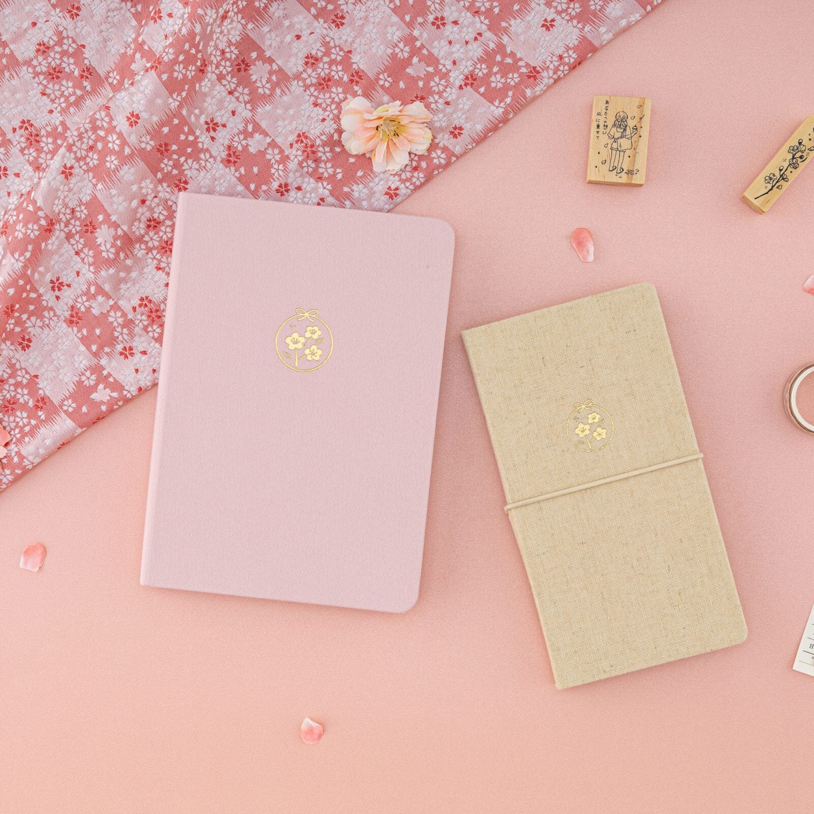 Celebrate the beautiful sakura season with this magical bujo! Decorated with an enchanting gold cherry blossom design resting on a soft pink linen cover. Feel inspired by the Japanese sakura season + recreate the full aesthetic with our matching items from our Sakura Breeze collection! Perfect for imagining your springtime wishes, affirmations + scrapbook collages on each silky dot grid notebook page.