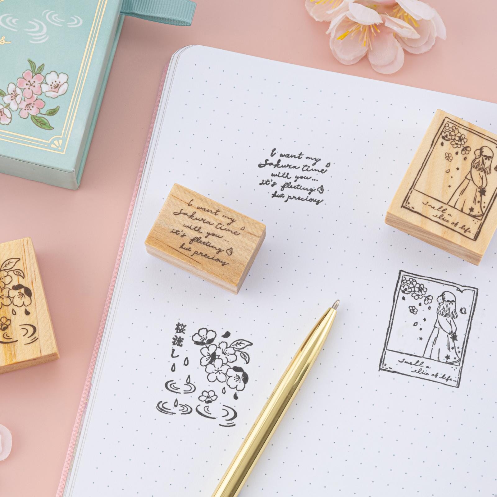 - 9x wooden stamps, including: 1x functional frame stamp, 1x text stamp, 7x cherry blossom decorative stamps - add new patterns to your bujo spreads!