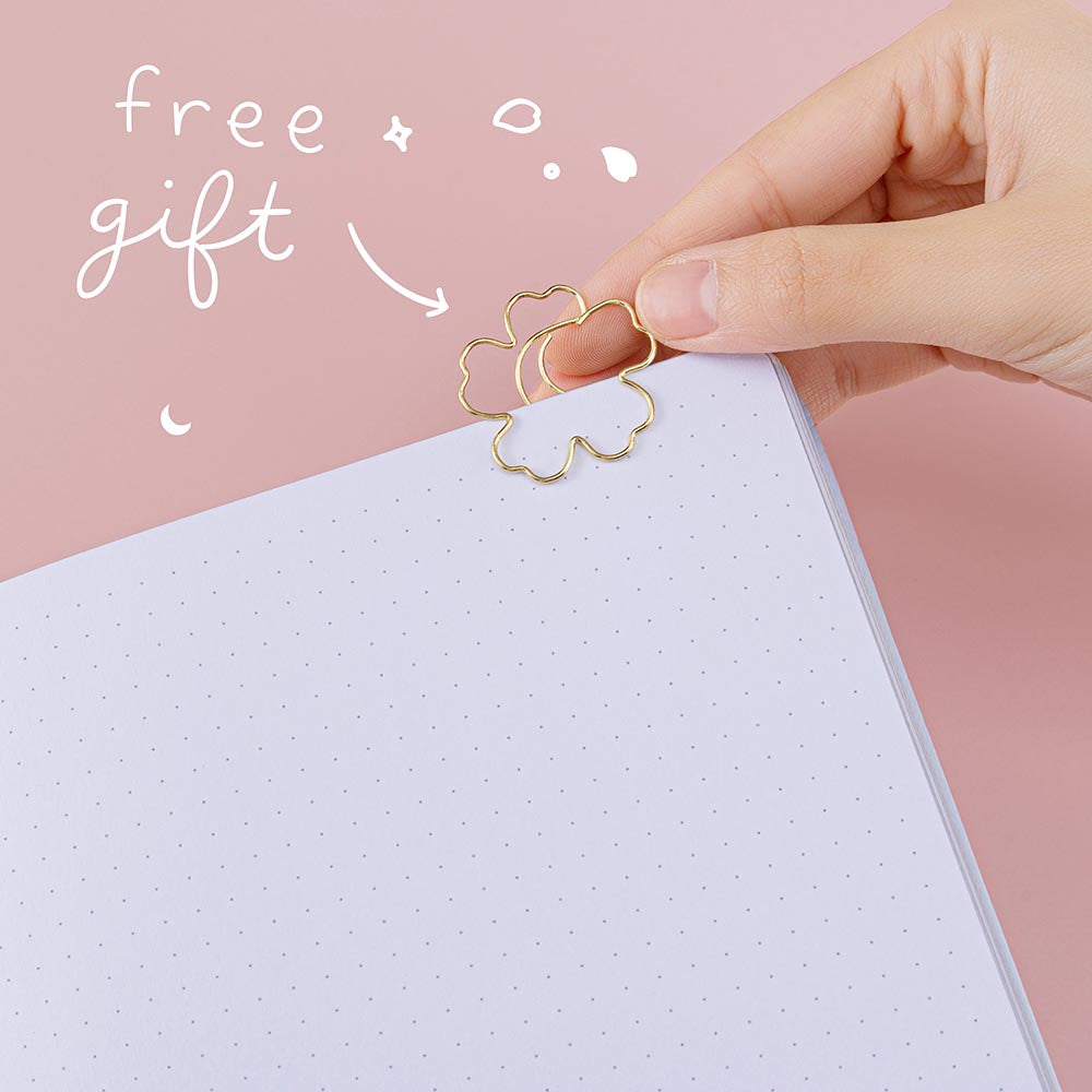 Come on a springtime journey with us and our new sakura themed bujo! With a periwinkle blue cover + elegant pearl gold foil design, experience the magic of Japanese cherry blossoms in full bloom. Once you turn the page and feel the ultra-thick dot-grid notebook paper, let your mind wander to possibilities of decorative spreads, fluttering diary entries + scrapbook pages, just like our matching Lunar Blossom Bujo! Use with items from our new Sakura Journey Collection to complete the aesthetic.