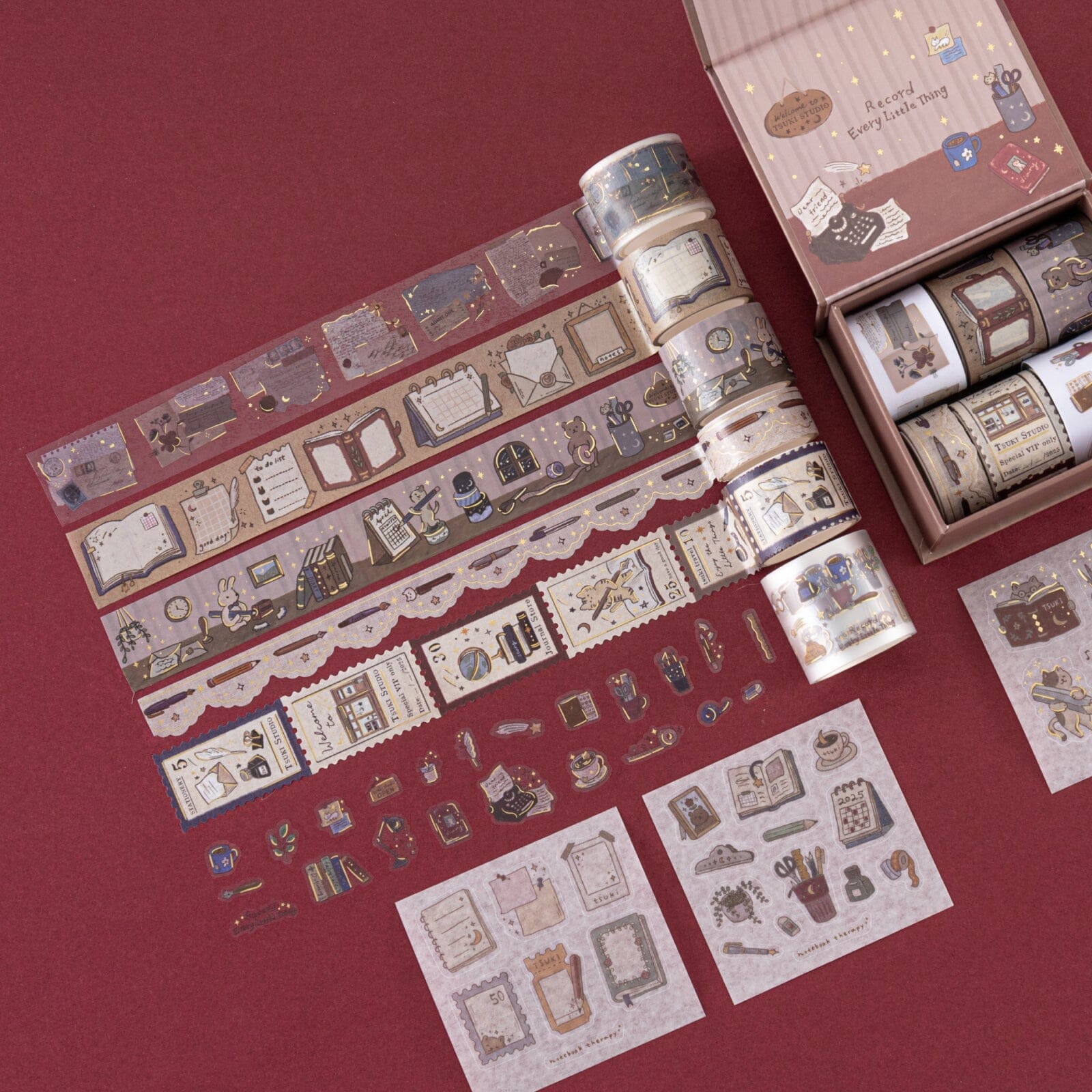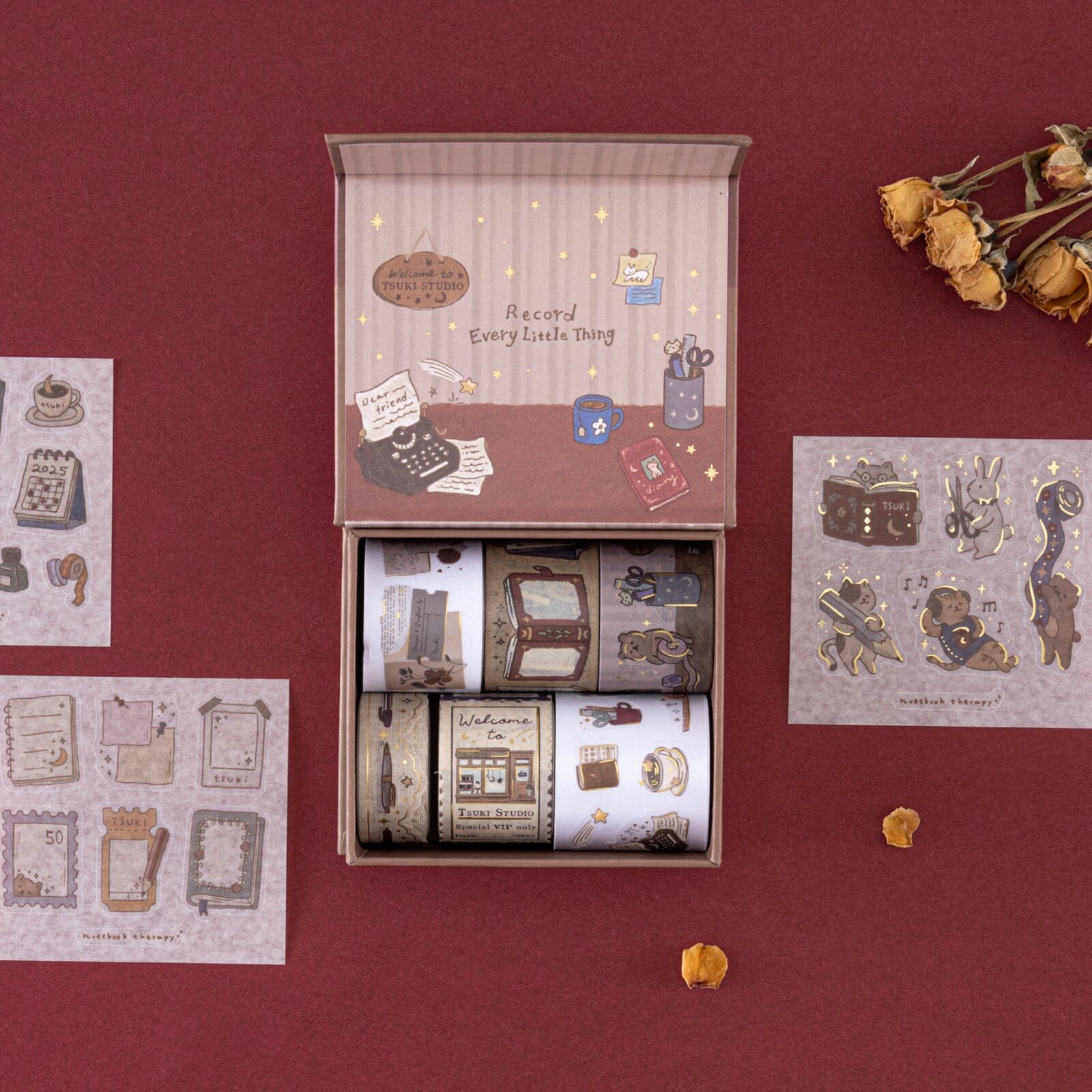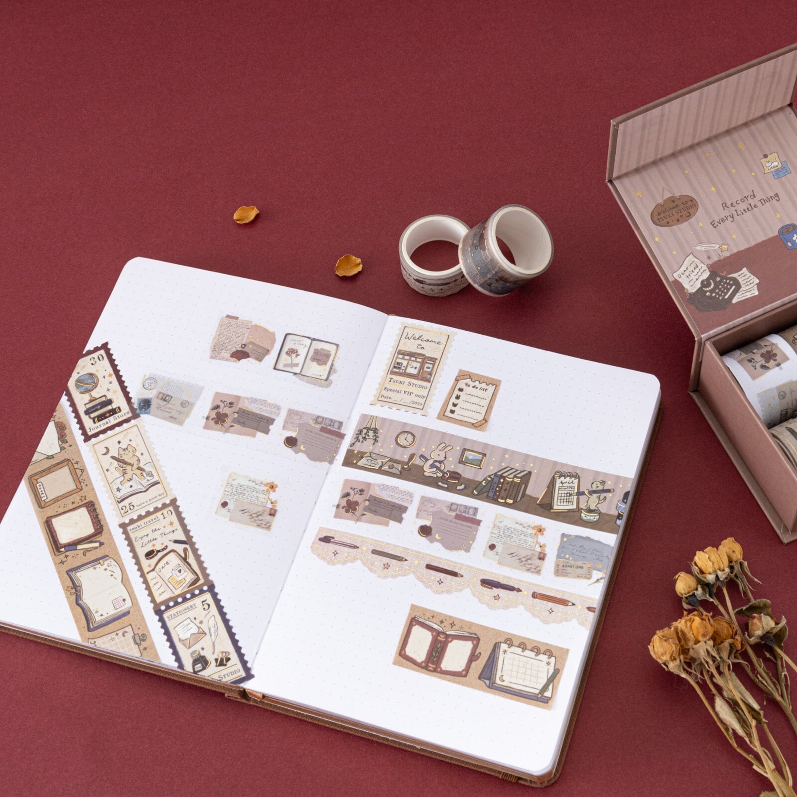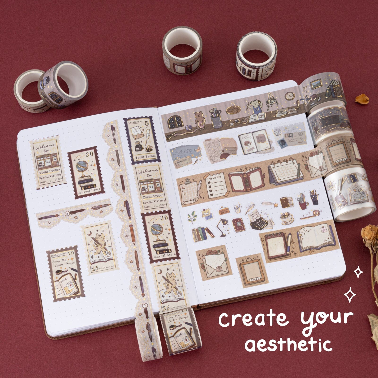 Part of our Tsuki Studio collection, this collection is inspired by all things tsuki to take you behind the scenes and show you our studio. Vintage stationery lovers will delight in opening the special gift box to reveal six unique tapes, decorated with stationery illustrations + our cute tsuki friends! From a functional writing tape to a beautiful sticker roll, these adorable washi tapes will light up any bullet journal, penpal letter or scrapbook.