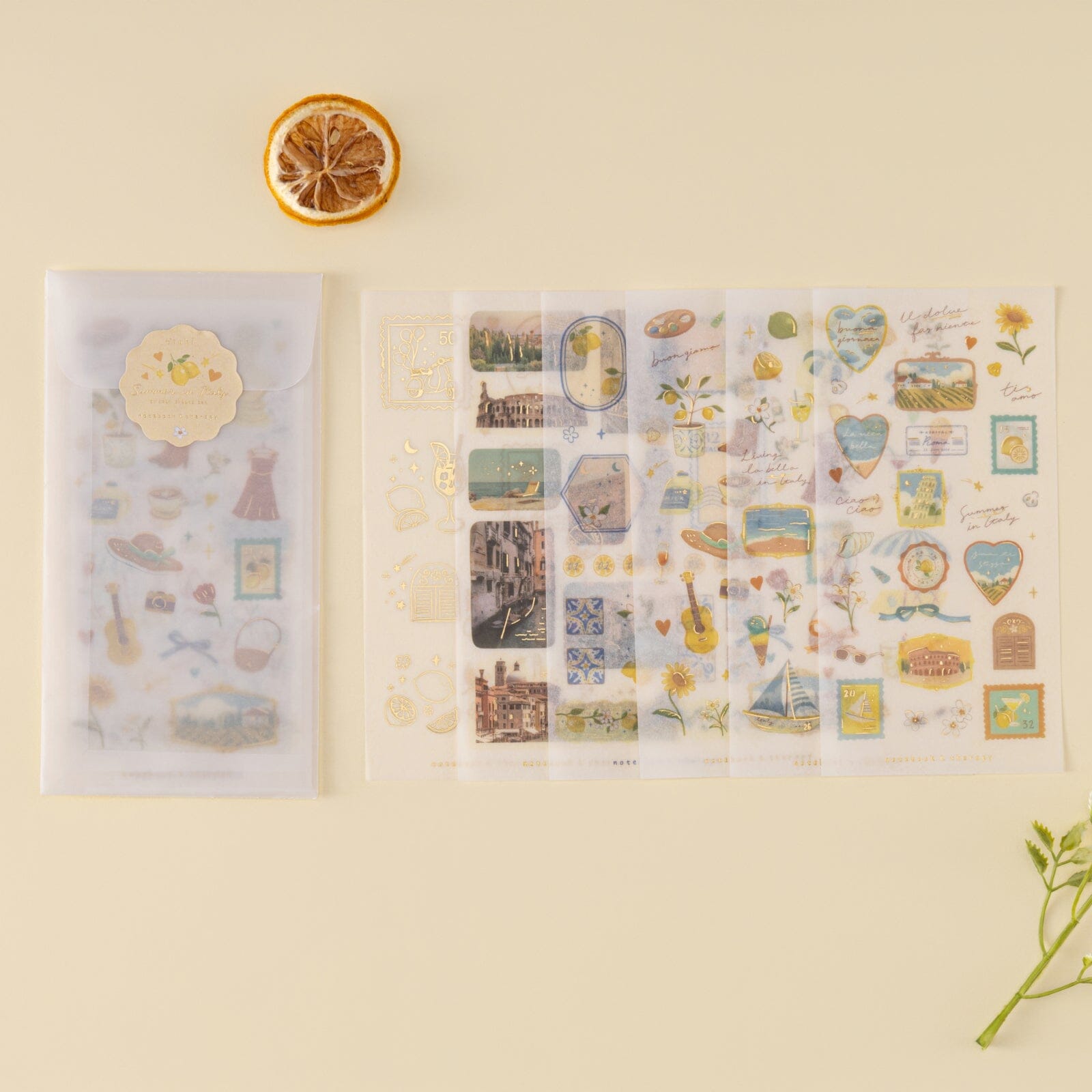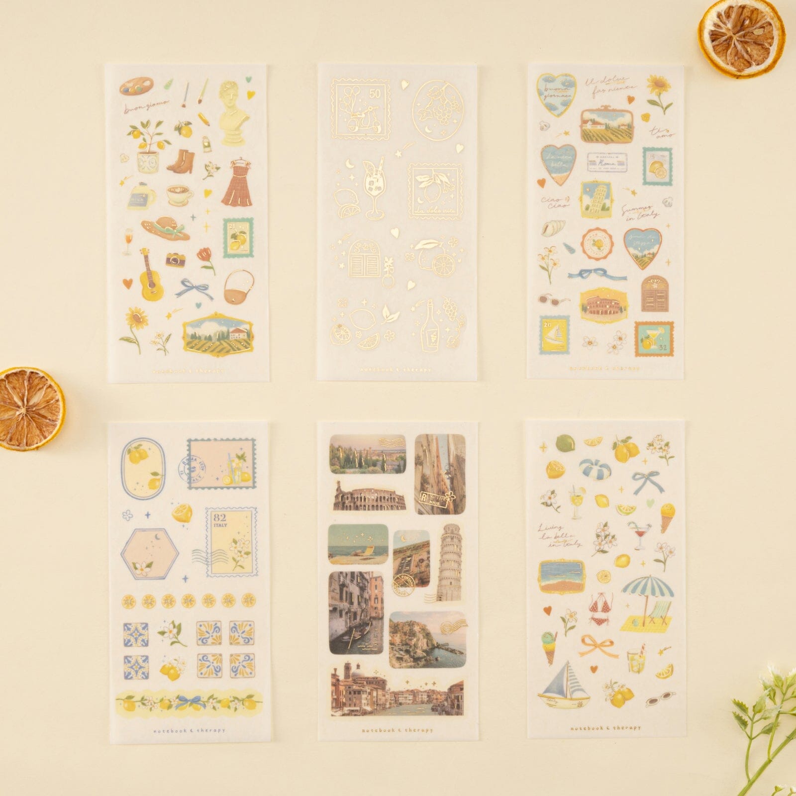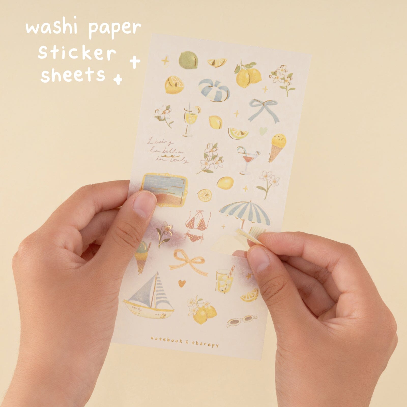 These Tsuki Summer in Italy sticker sheets are perfect for decorating your penpal letters, bullet journals, scrapbooks and junk journals with fresh lemon + Italian countryside elements for a Mediterranean summer aesthetic.