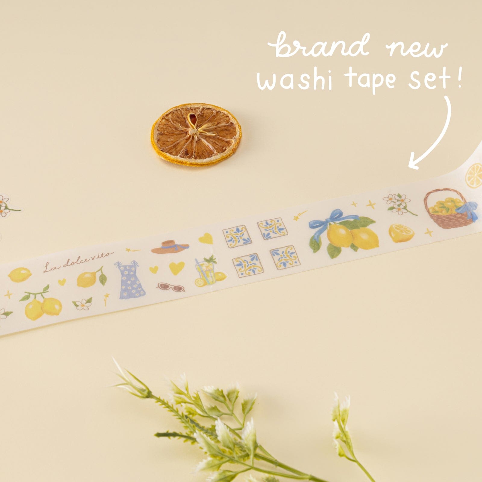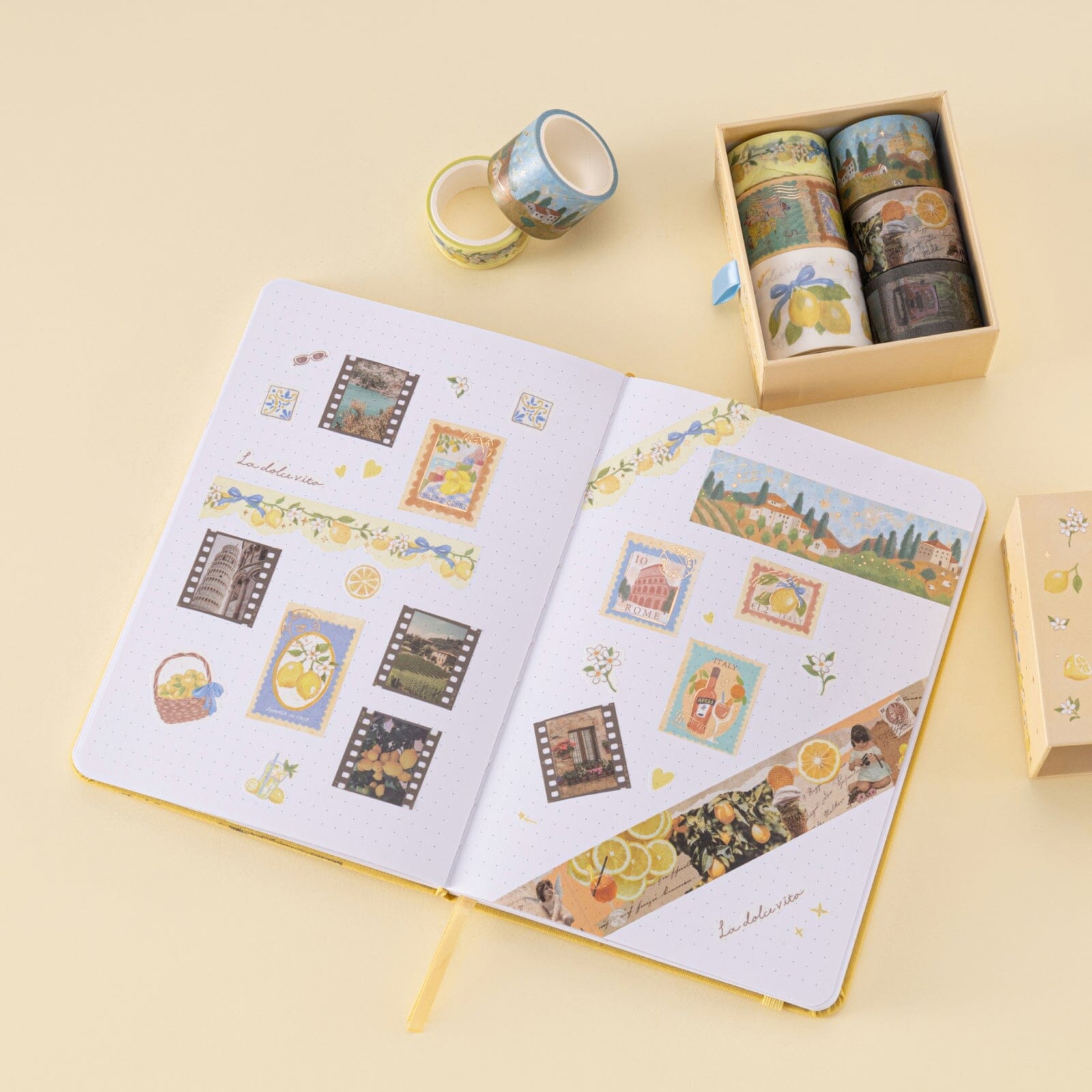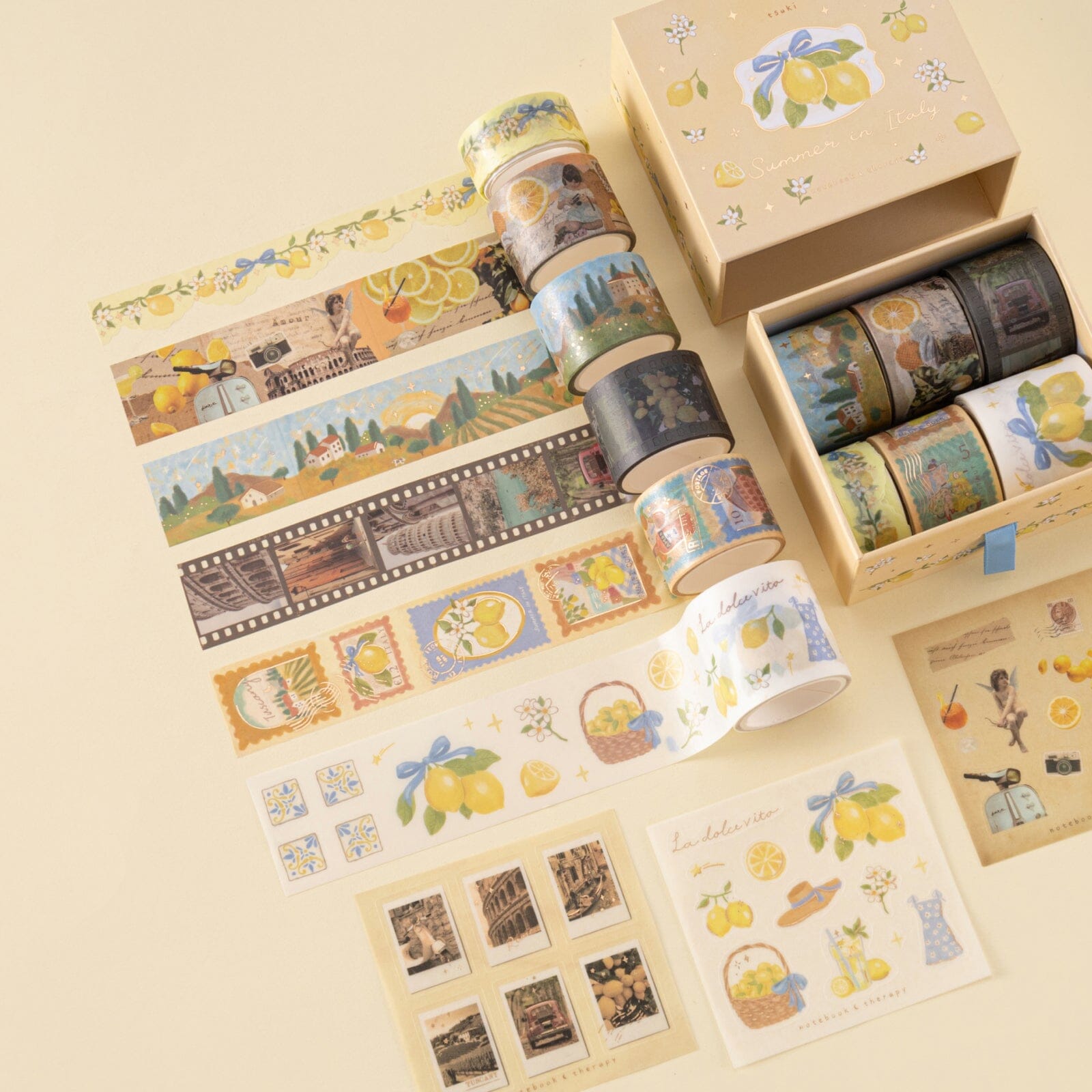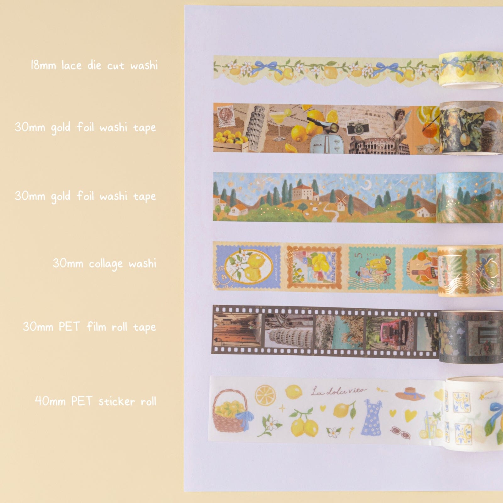Transport yourself to a lovely summer in Italy with our beautifully designed washi tapes! This set is crafted to evoke the essence of Italian summers, featuring fresh lemon patterns and a countryside charm.