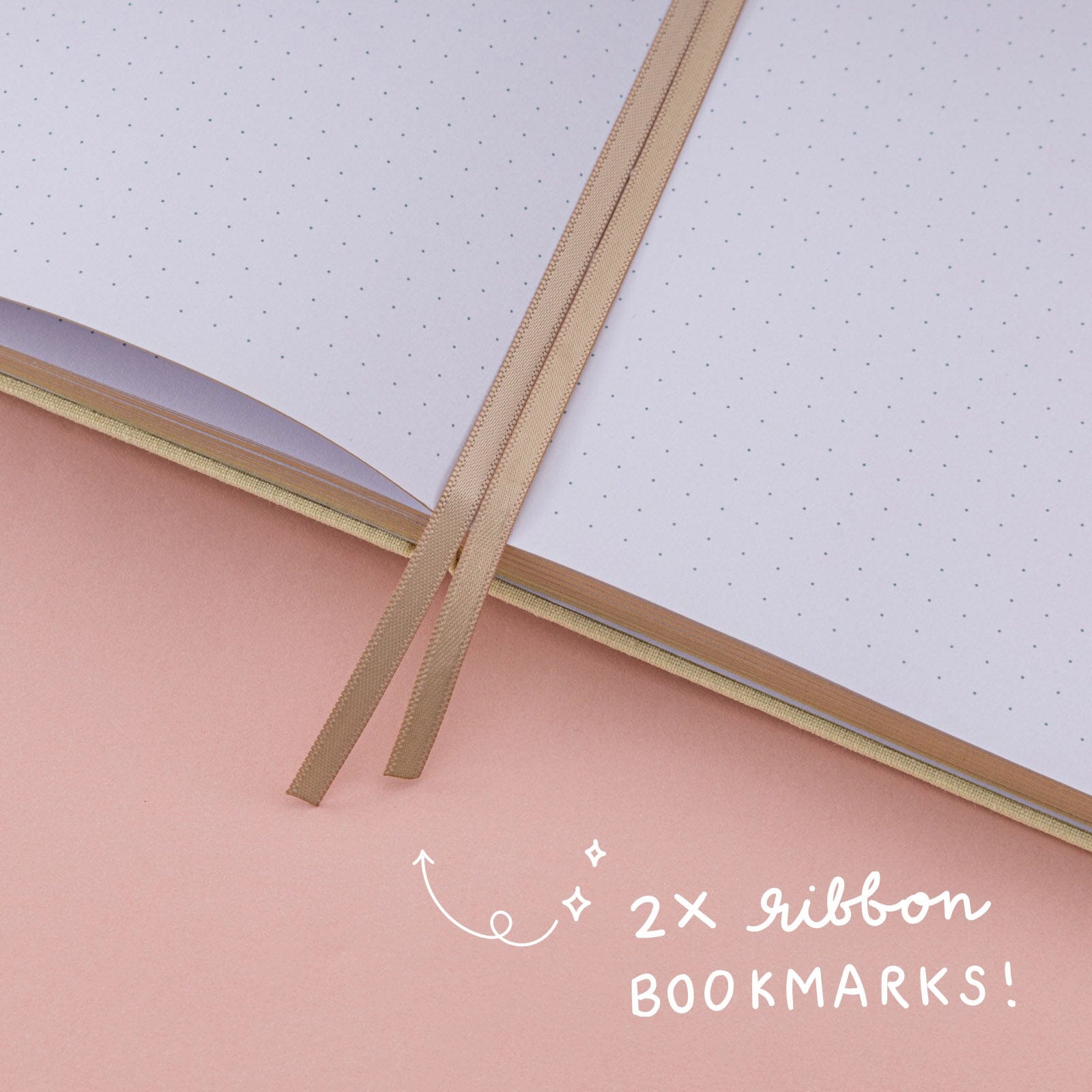 Inspired by the soft + angelic cherubs, enjoy an elegant angelcore theme with this ultra-calming bujo. Wrapped in a cream linen fabric cover + decorated with an adorable gold foil cherub + filled with our signature bright white dot grid notebook paper.