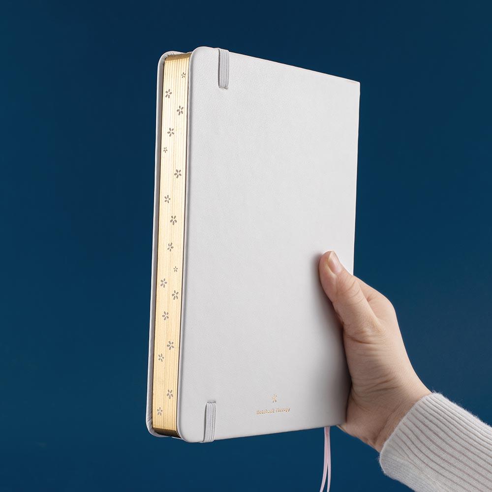 Inspired by the winter snow + heavenly Moonflower that blooms only at night; our Tsuki MoonFlower Bullet Journal Winter Edition adds a twist to our beloved MoonFlower design with a winter white vegan leather cover. With beautiful floral etched metallic gold pages edges, this luxury limited edition design of Tsuki 160GSM dot grid notebooks brings a deluxe, elegant aesthetic to your bullet journal experience!